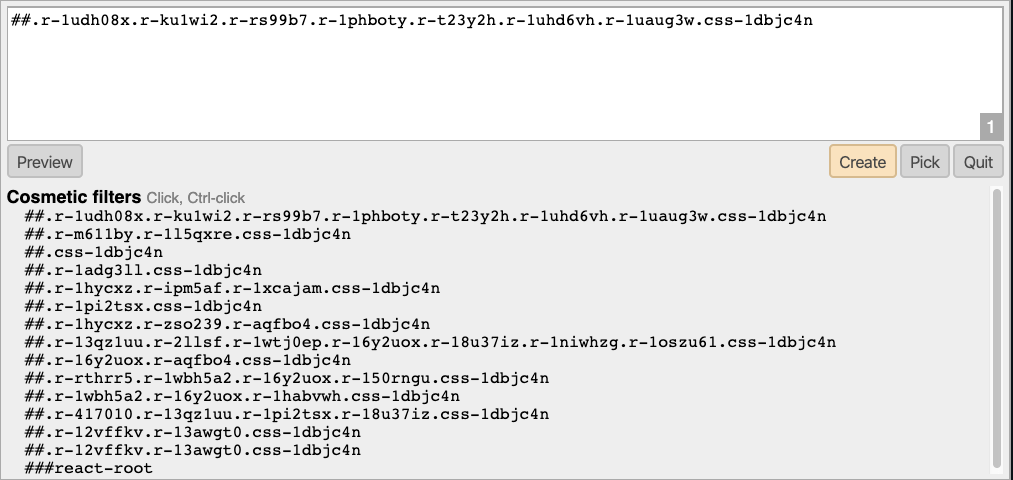 Click the uBlock Origin extension icon, click the picker icon to enter element picker mode, and then select one part of the page you want to hide forever.