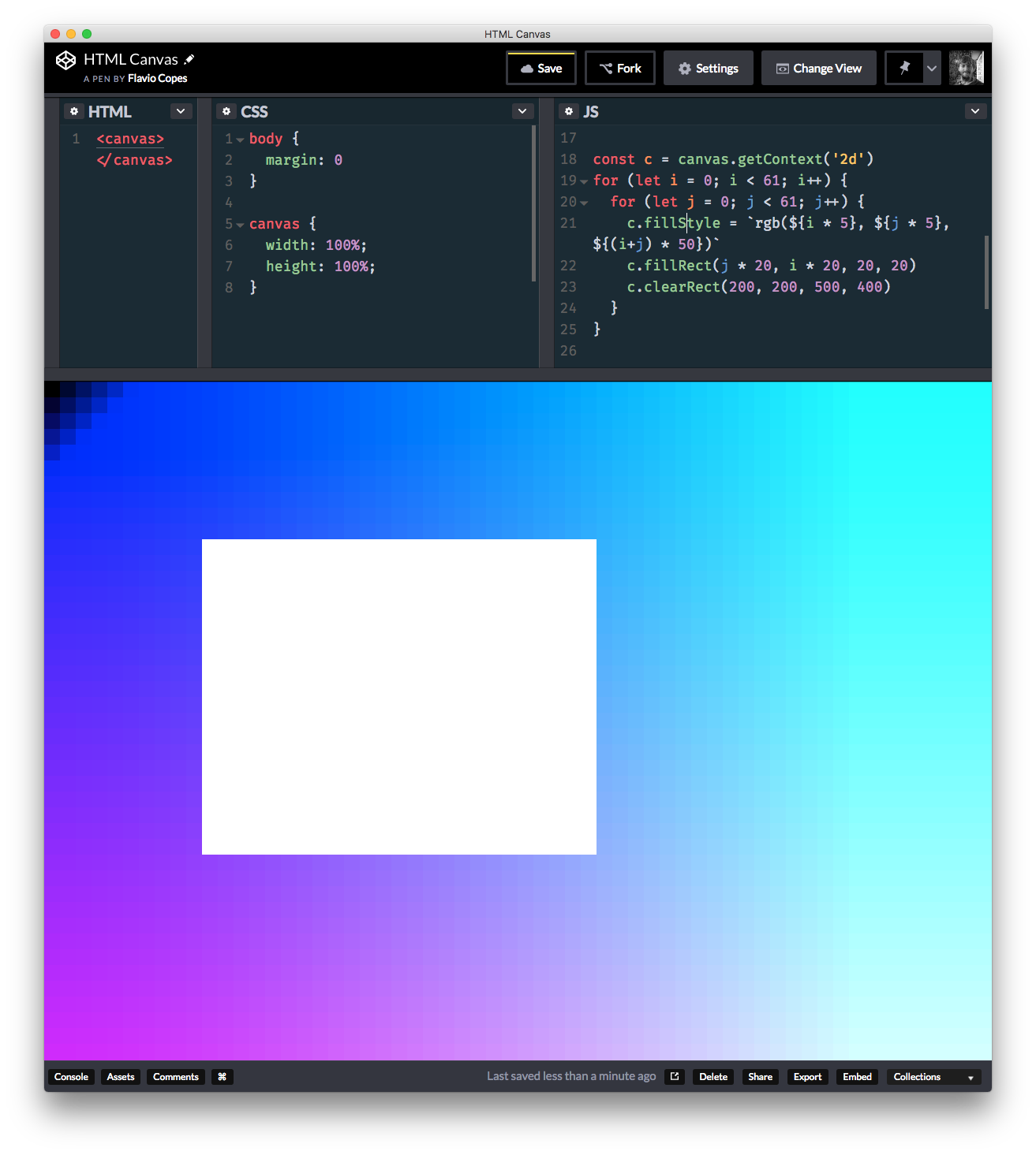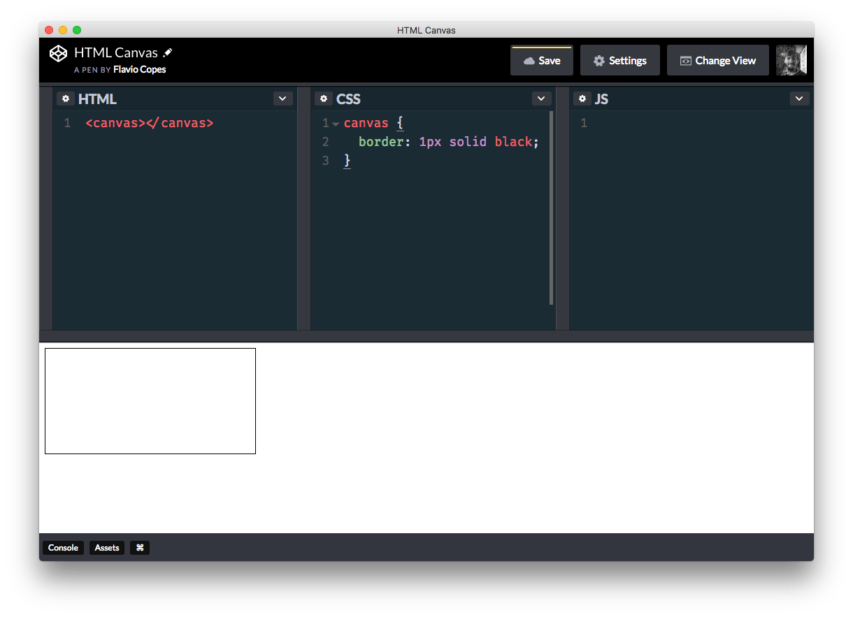Creating a canvas is as simple as dropping a <canvas></canvas> in a blank HTML file: