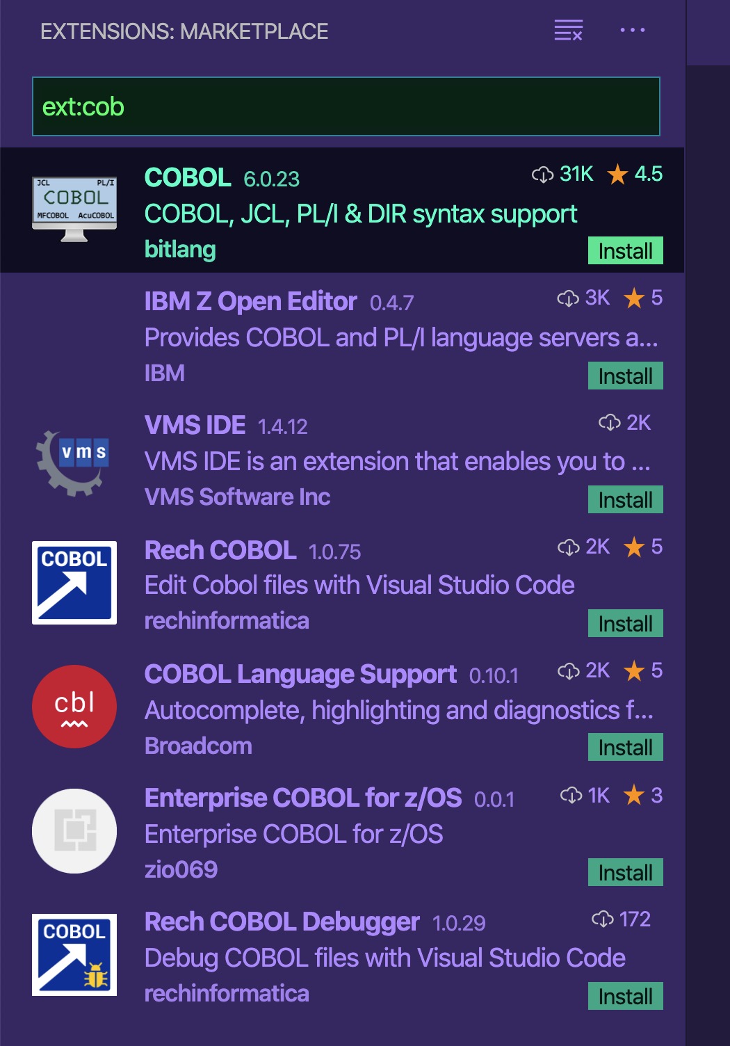 I’m going to install the first and most popular, named COBOL, to provide syntax highlighting.