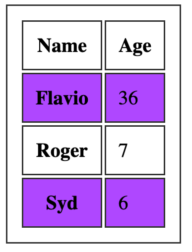 One common thing with tables is the ability to add a color to one row, and a different color to another row. This is possible using the :nth-child(odd) or :nth-child(even) selector: