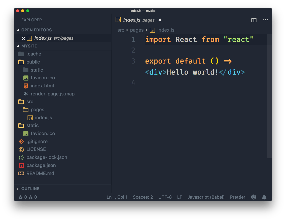 .cache, an hidden folder that contains the Gatsby internals, nothing you should change right nowpublic, which contains the resulting website once you build itsrccontains the React components, in this case just theindexcomponentstaticwhich will contain the static resources like CSS and images