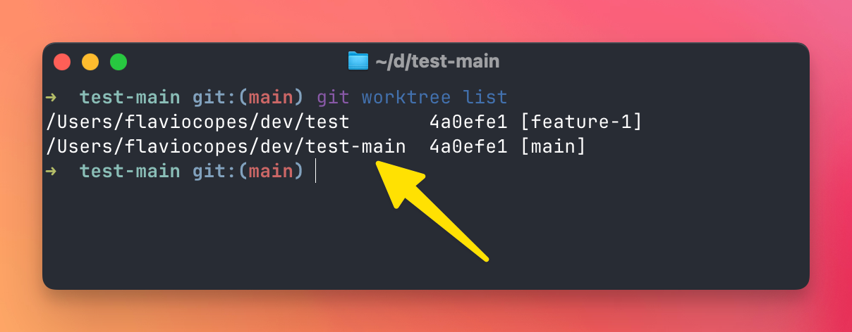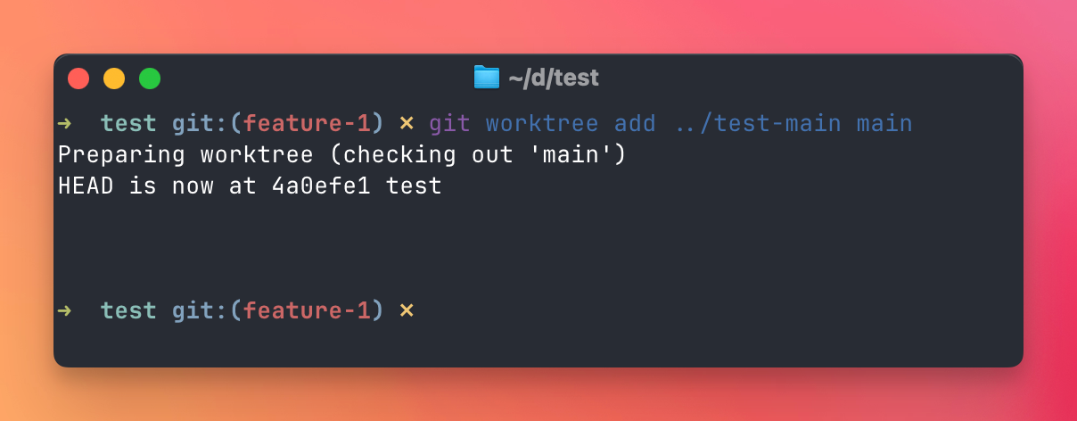 Alternatively you could stash the changes, but with worktrees it’s even simpler, you can open another terminal and work on the main branch in a separate directory, while keeping your feature branch work intact in the original directory.