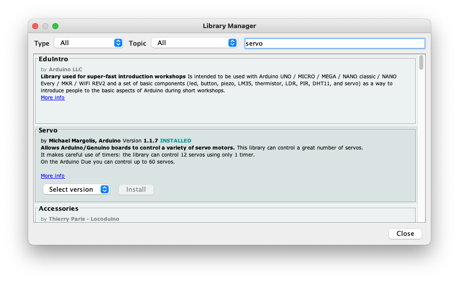 Click the “More info” link, this will open the page https://www.arduino.cc/reference/en/libraries/servo/ in your browser.
