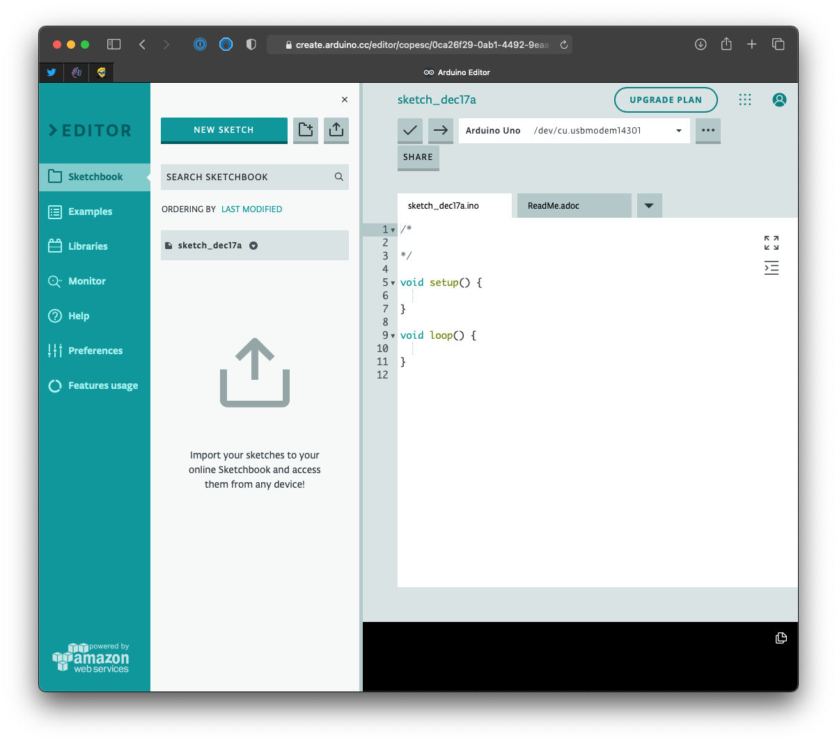 Head over to https://create.arduino.cc/editor, then you will immediately see a new sketch, the name Arduino gives to programs: