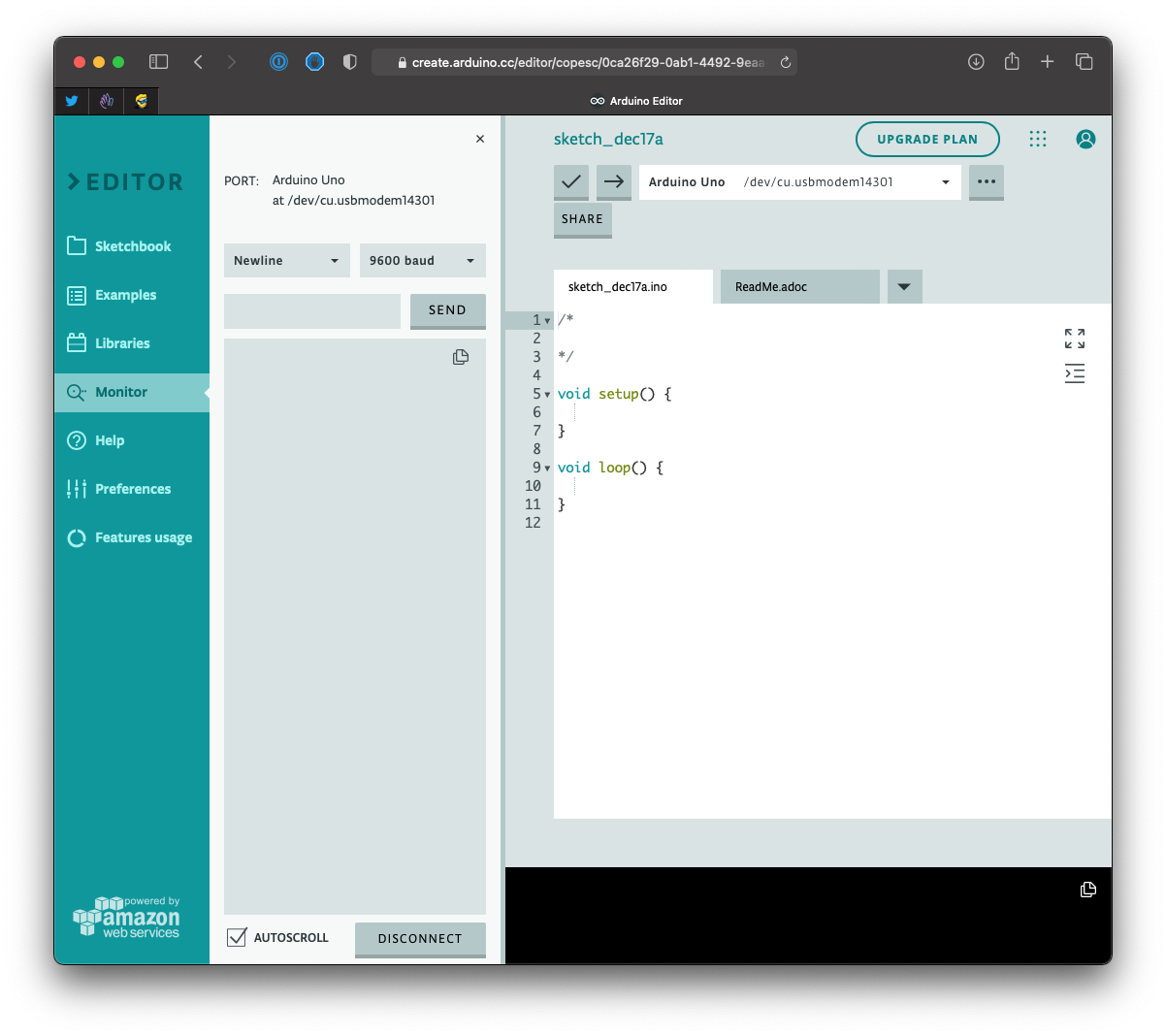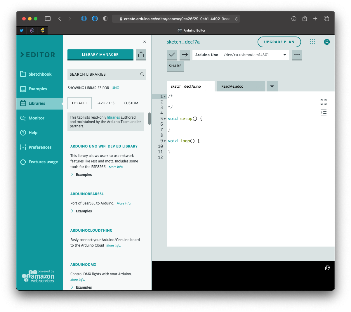 On top you can see it already recognized the Arduino Uno I connected to the USB port (the /dev/cu.usbmodem14301 line indicates the USB port). It automatically recognizes Arduino boards.
