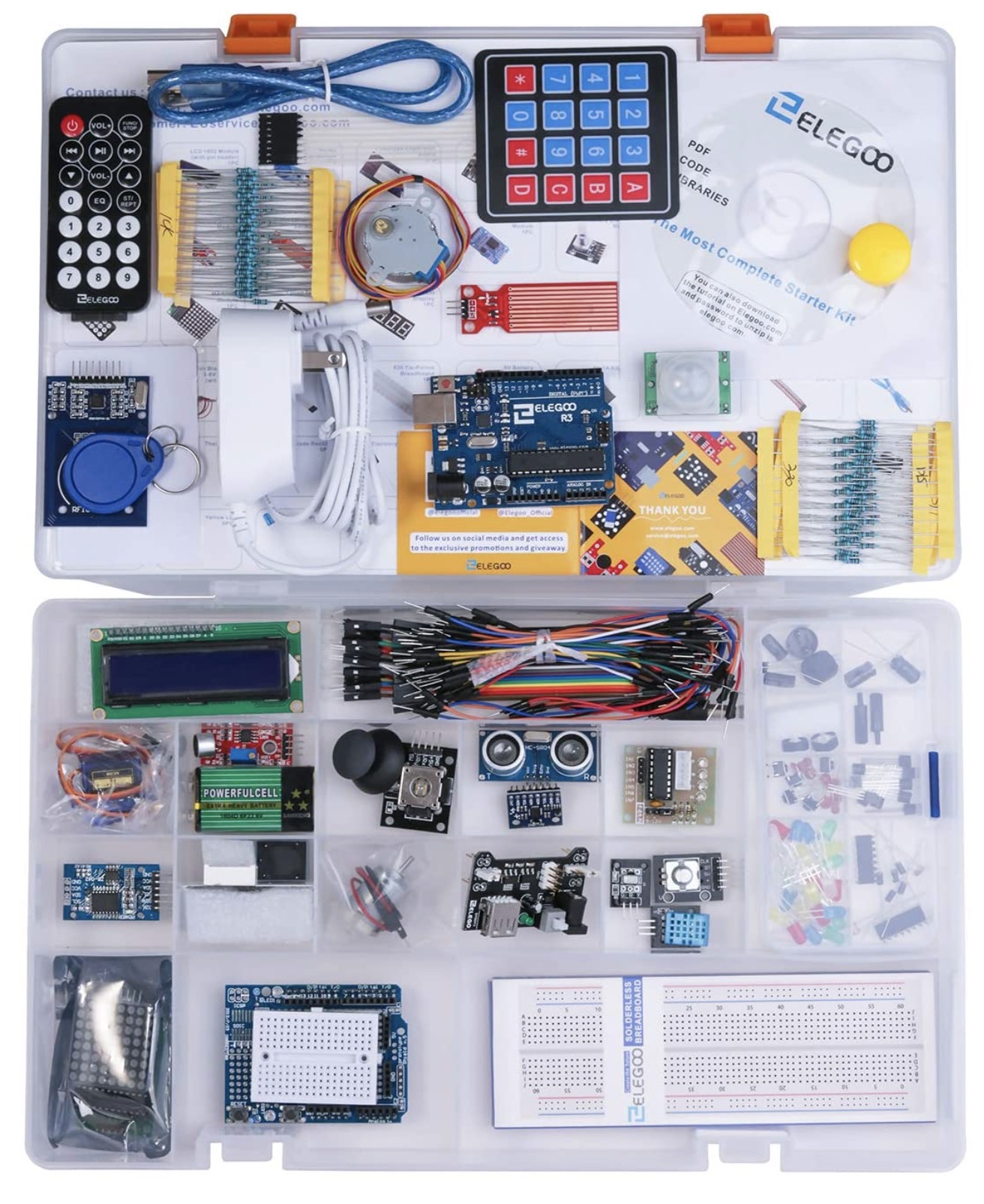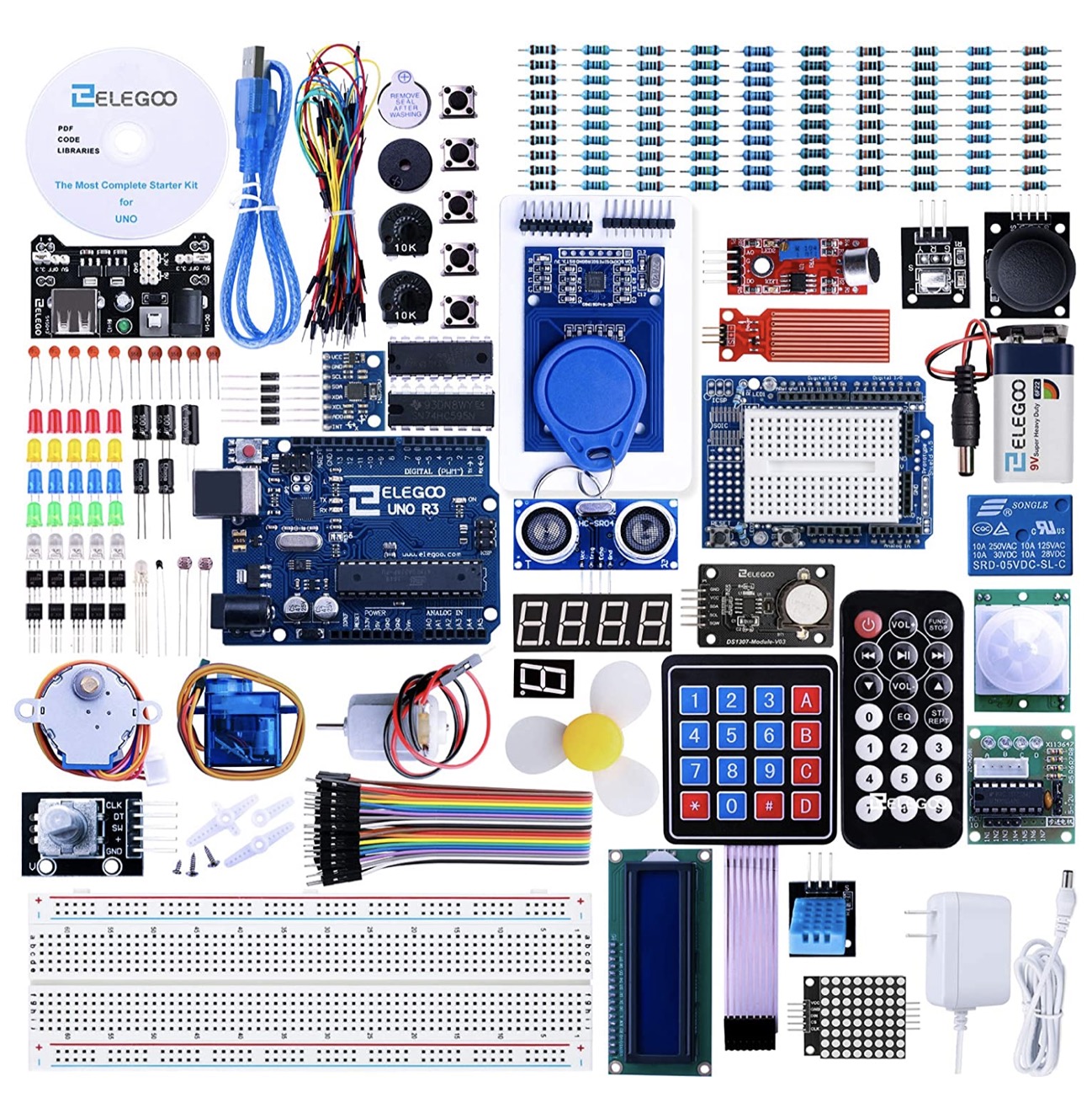 In particular I would suggest a kit made by Elegoo, that you can find on Amazon for $53.99 / 45€ at the time of writing. It’s called ELEGOO UNO R3 Project Most Complete Starter Kit w/Tutorial Compatible with Arduino IDE (63 Items).
