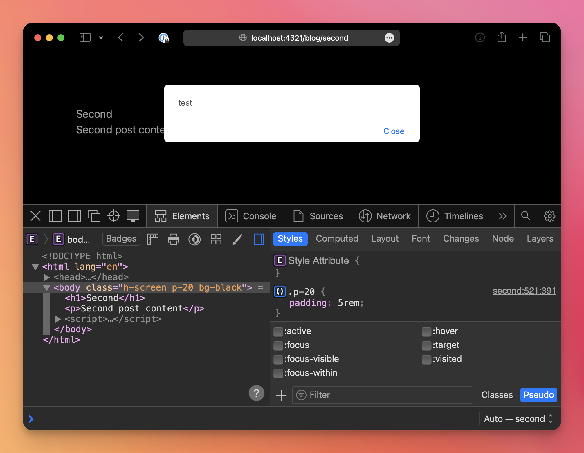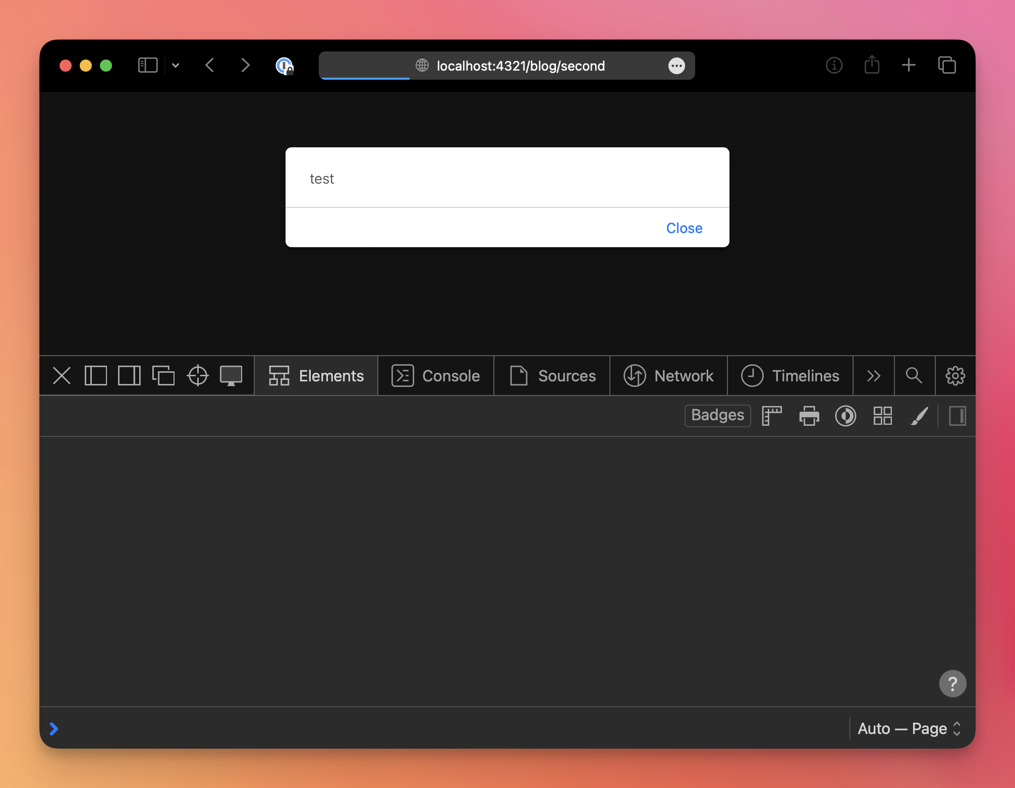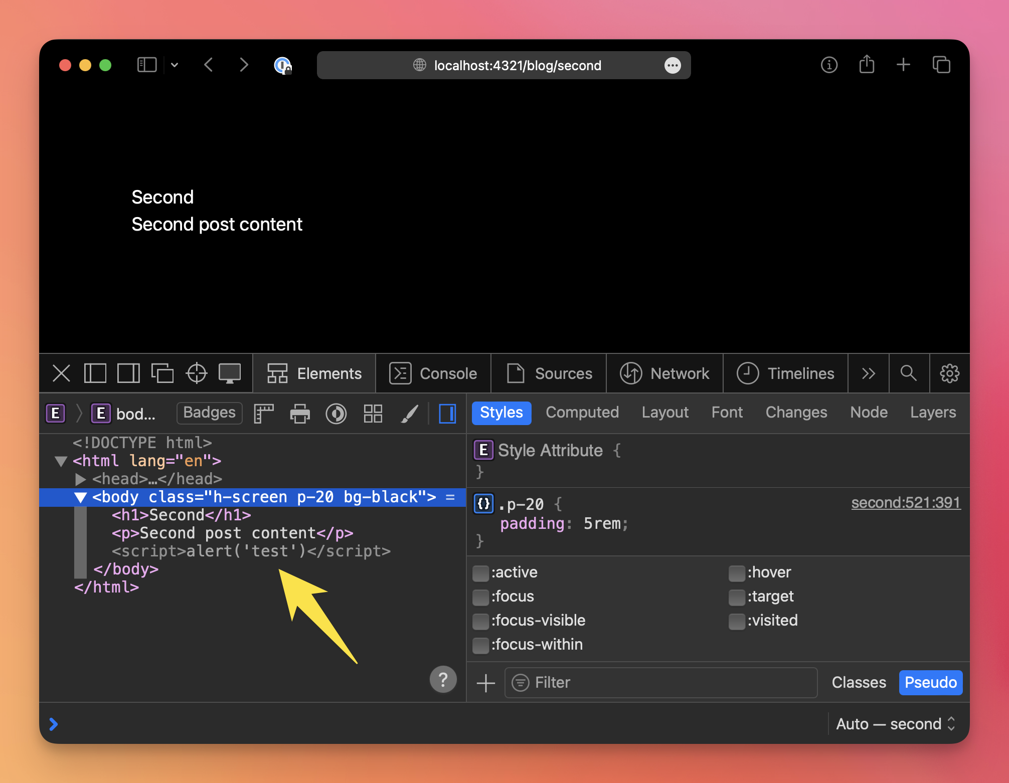 In this case the script is added to the page as-is, and if you try you’ll already see the difference, the alert() in this case is executed before the DOM is loaded (you don’t see anything in the DevTools inspector):