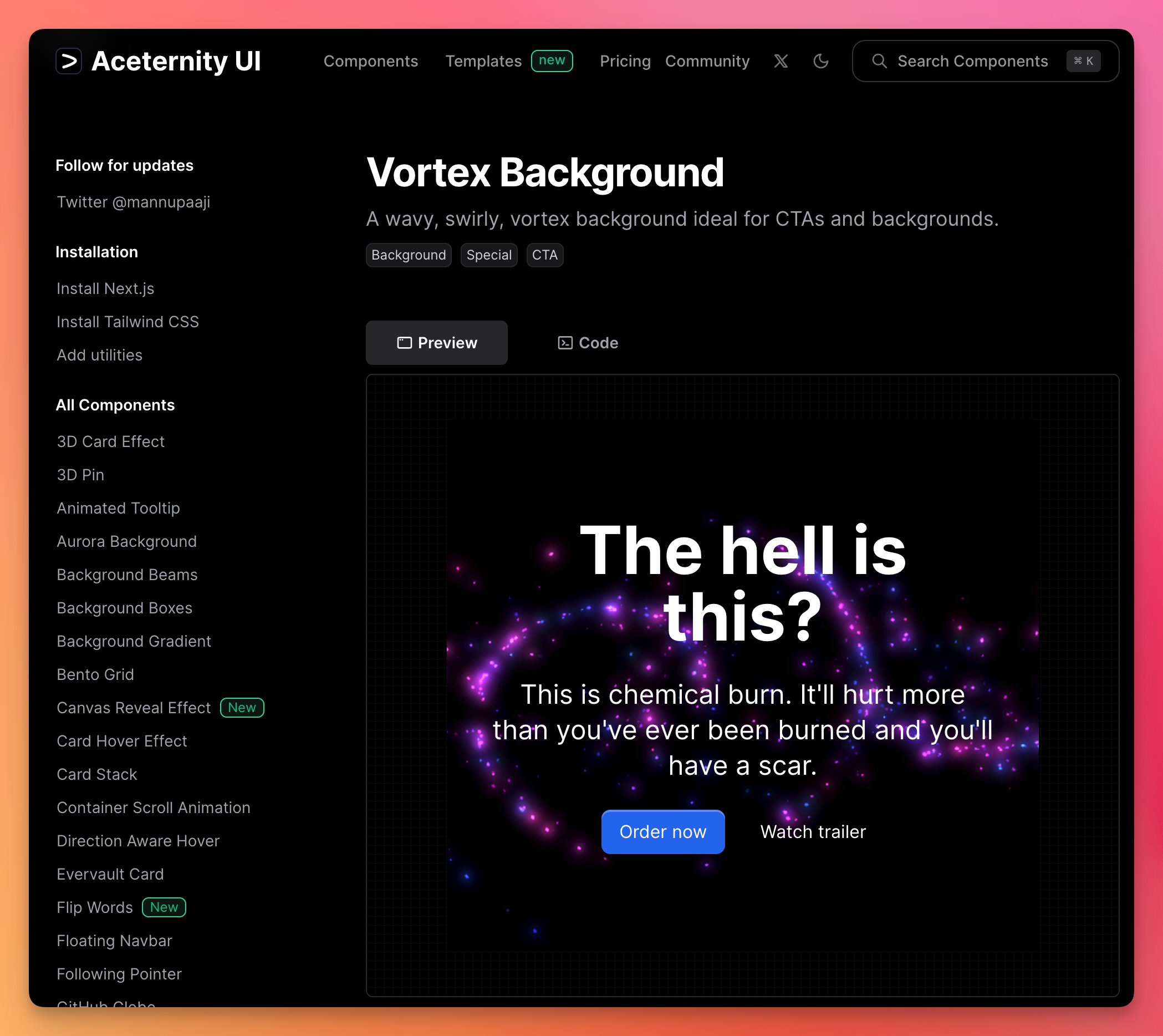 then I installed a couple libs that were needed by the animation, as instructed on https://ui.aceternity.com/components/vortex: