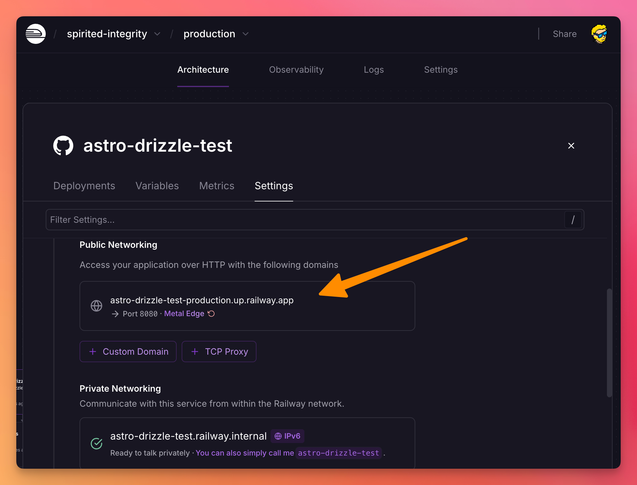 In the “Settings” tab now go down to the Networking options and add a Railway URL to the app:
