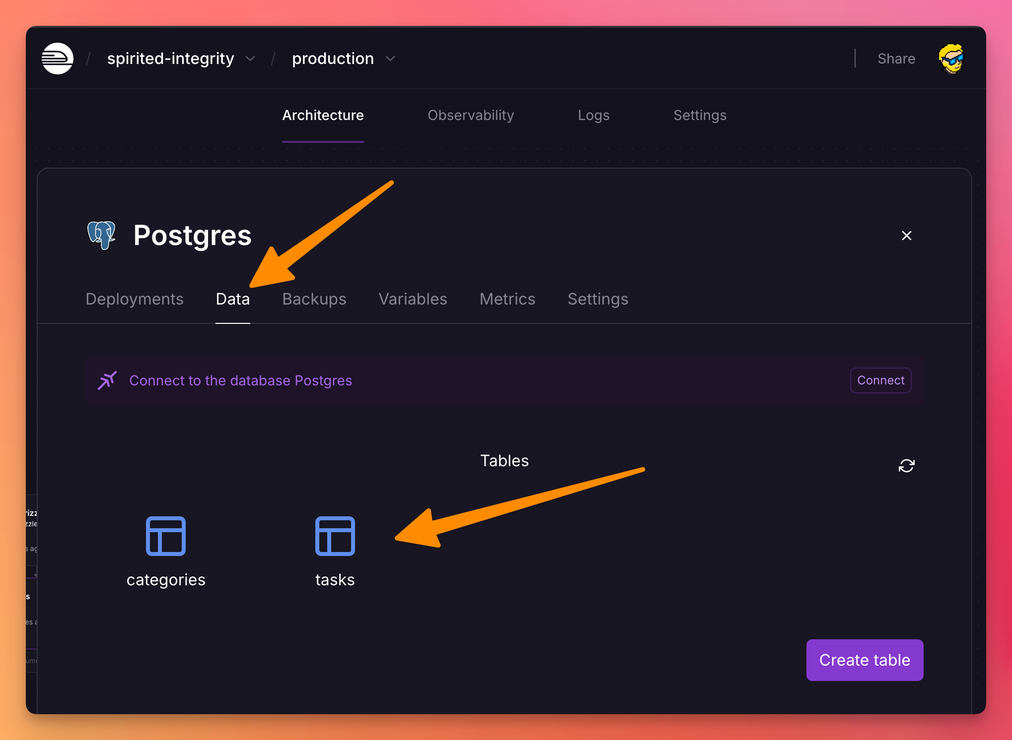 Now you should see the database tables in the PostgreSQL service on Railway.