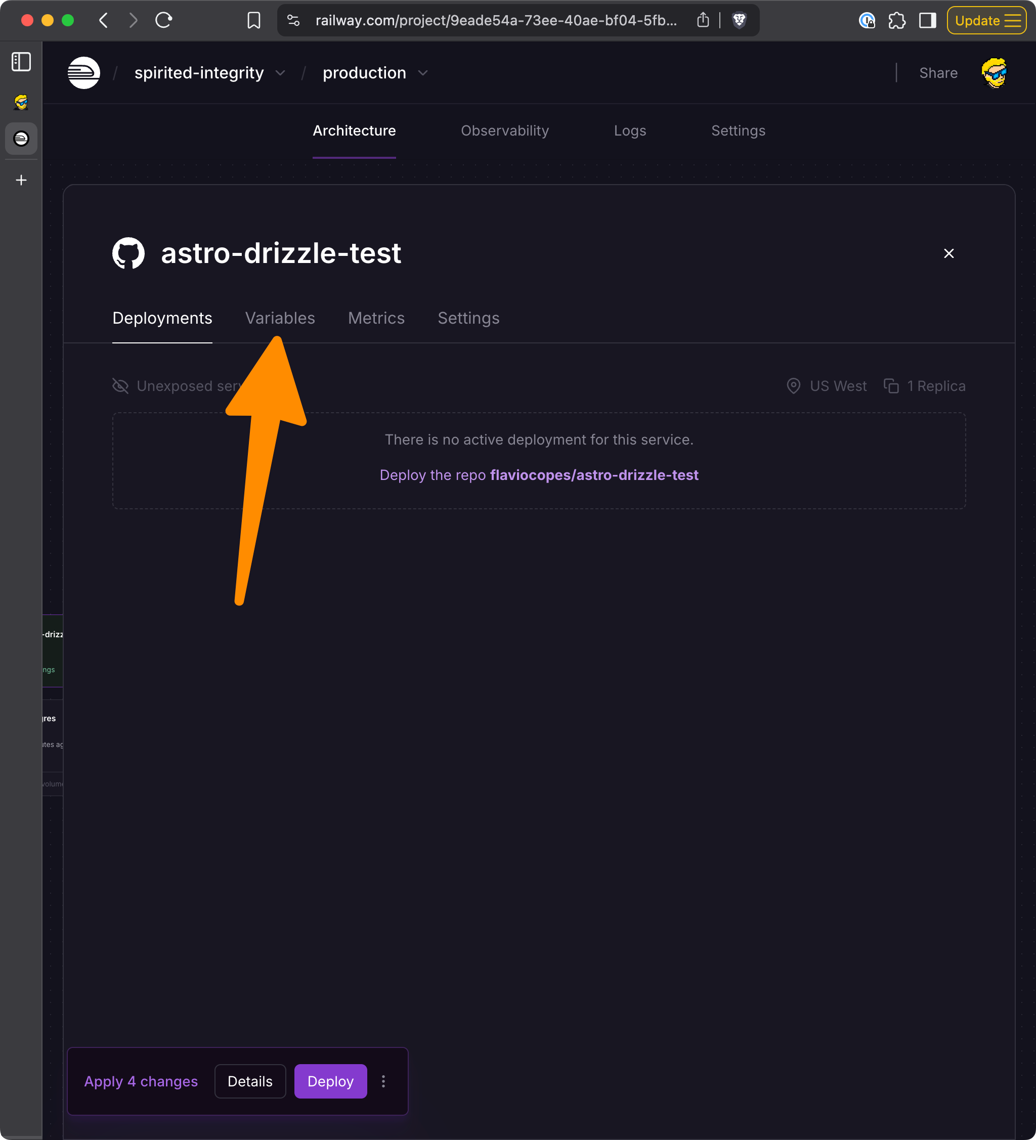 Now in the Variables tab of this service we connect the app to the database: