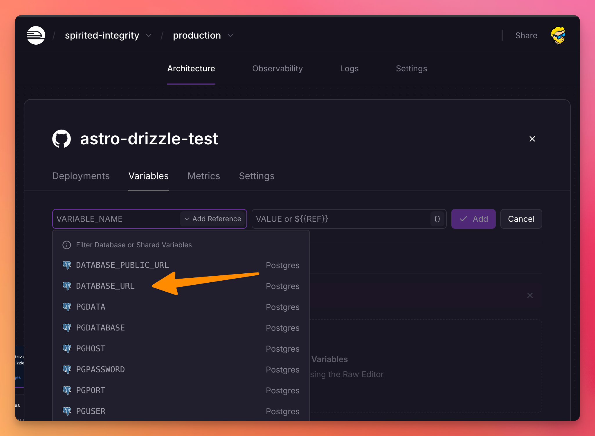 And you’ll find the DATABASE_URL variable, click it: