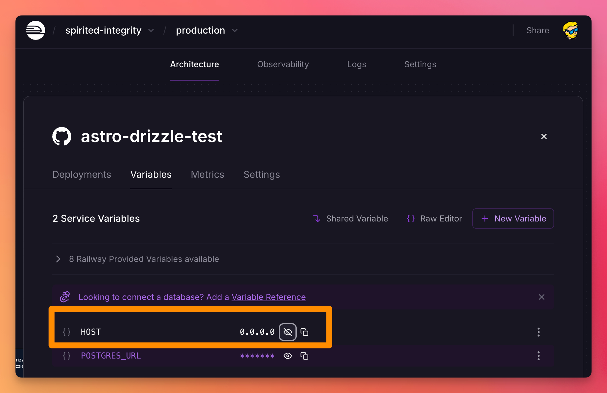 Ok now we need Astro to run on the host 0.0.0.0 . Add a HOST variable for this: