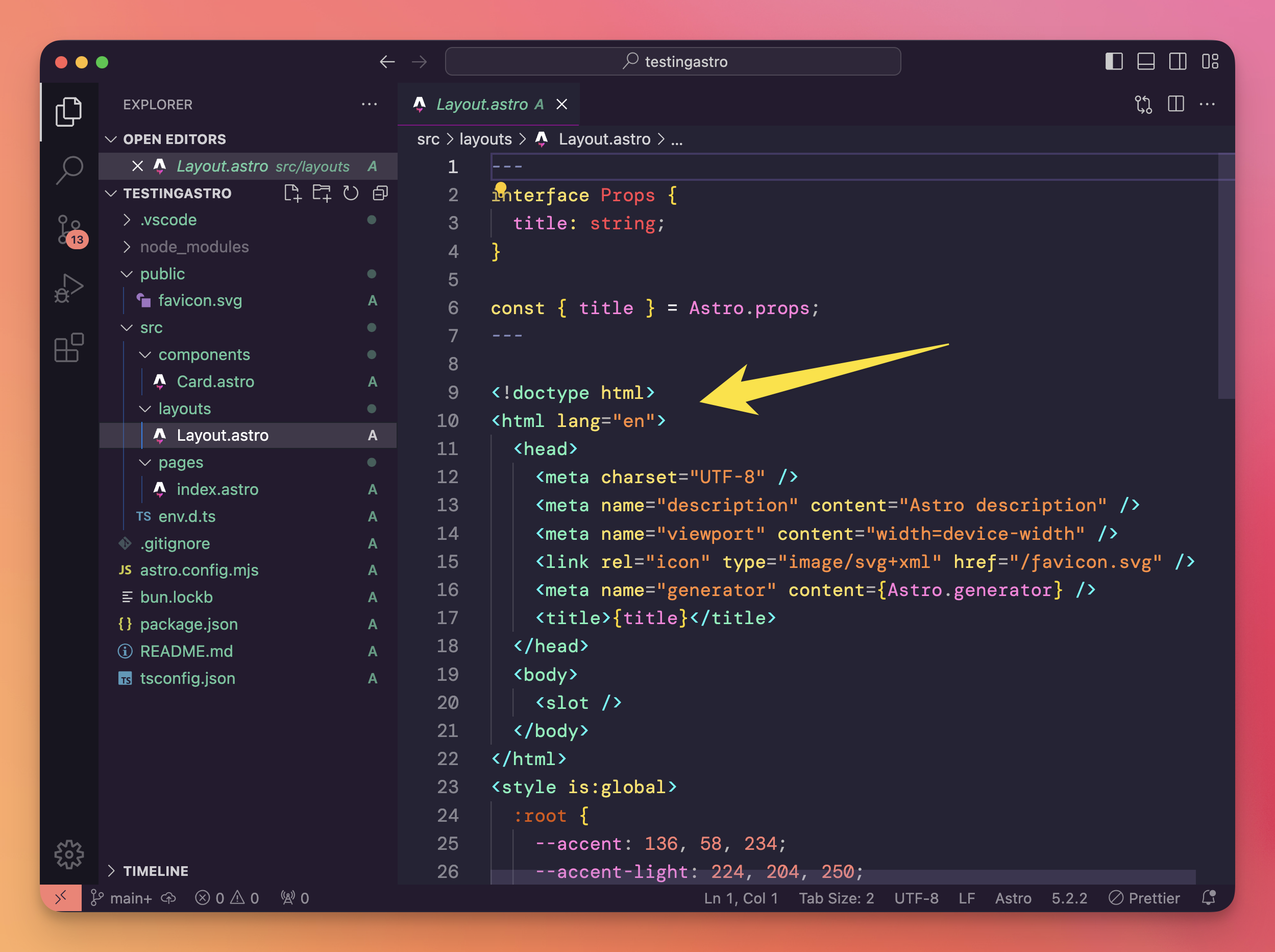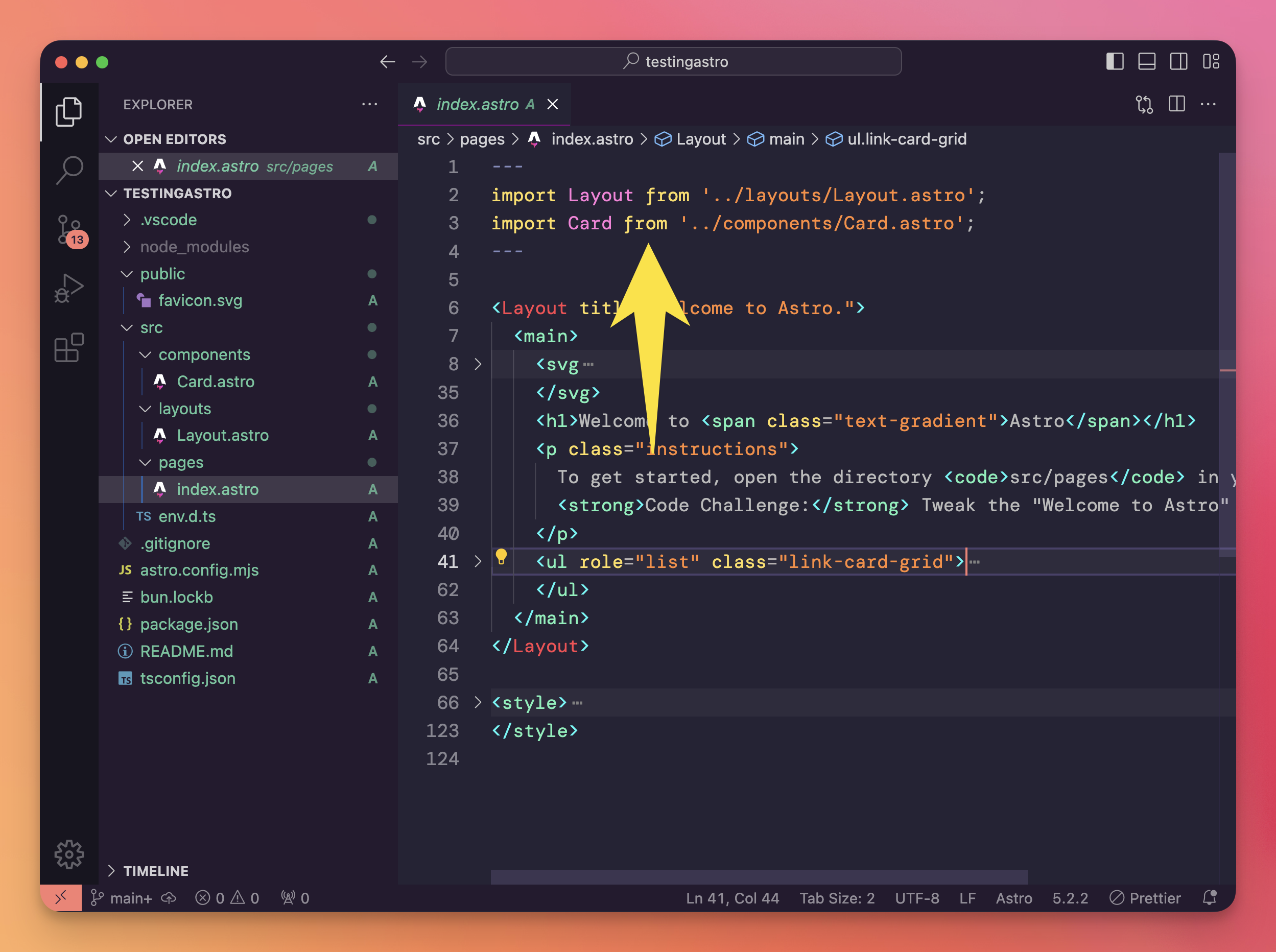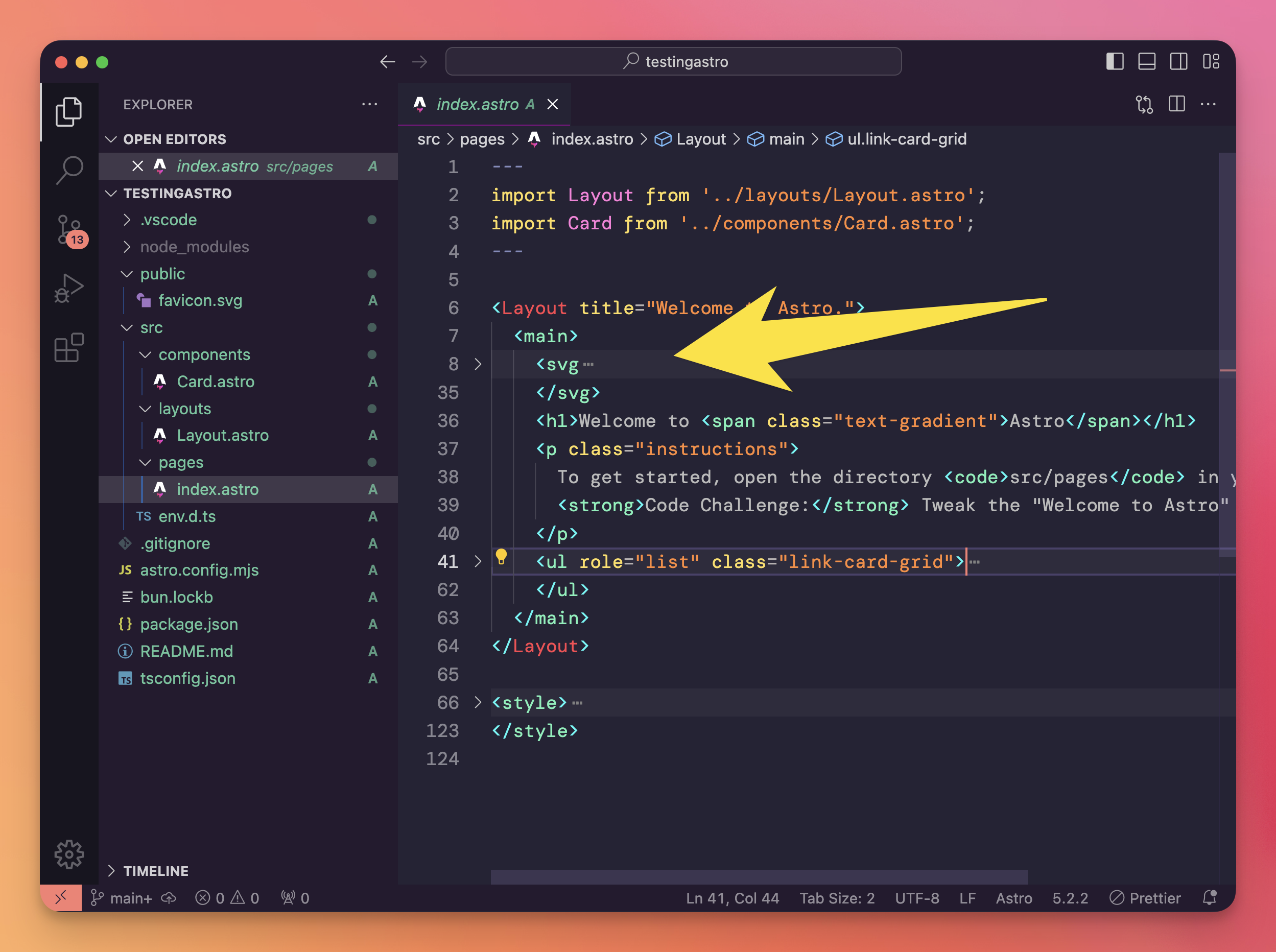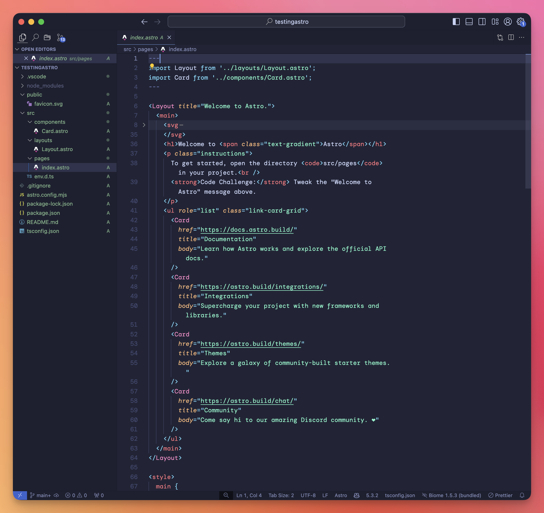 You now see src/pages/index.astro. This is the entry point for the / route, the one that serves the homepage.