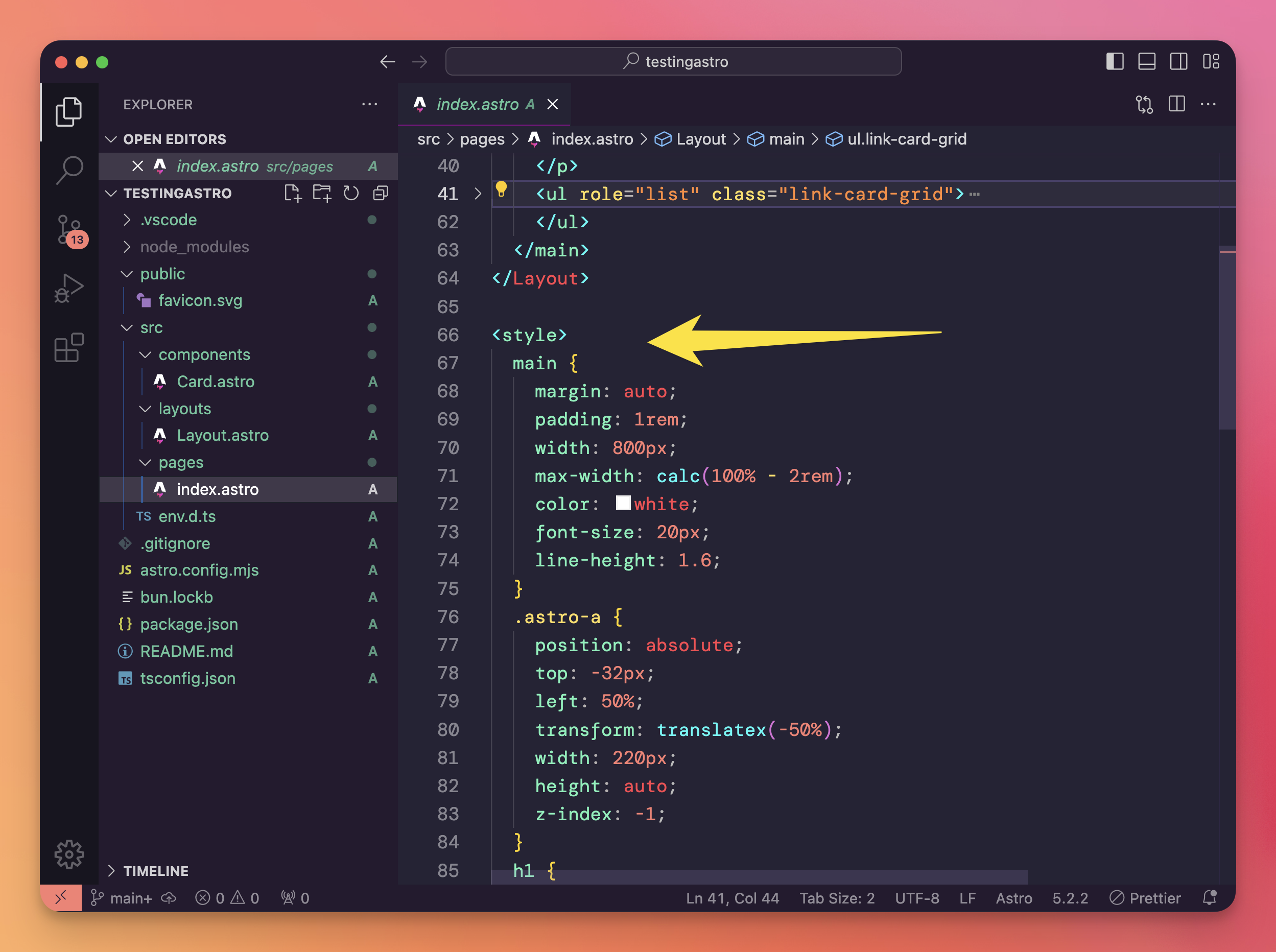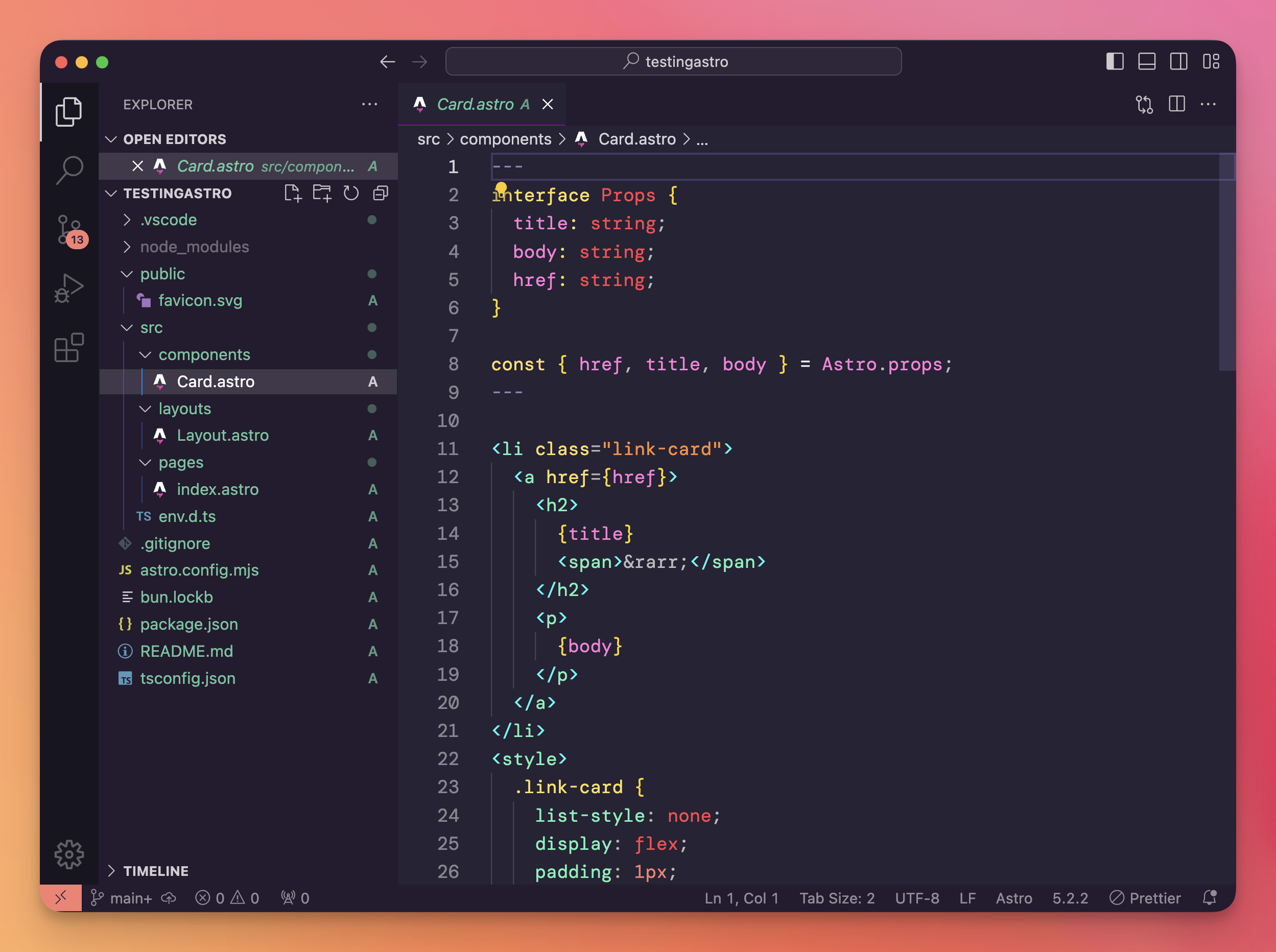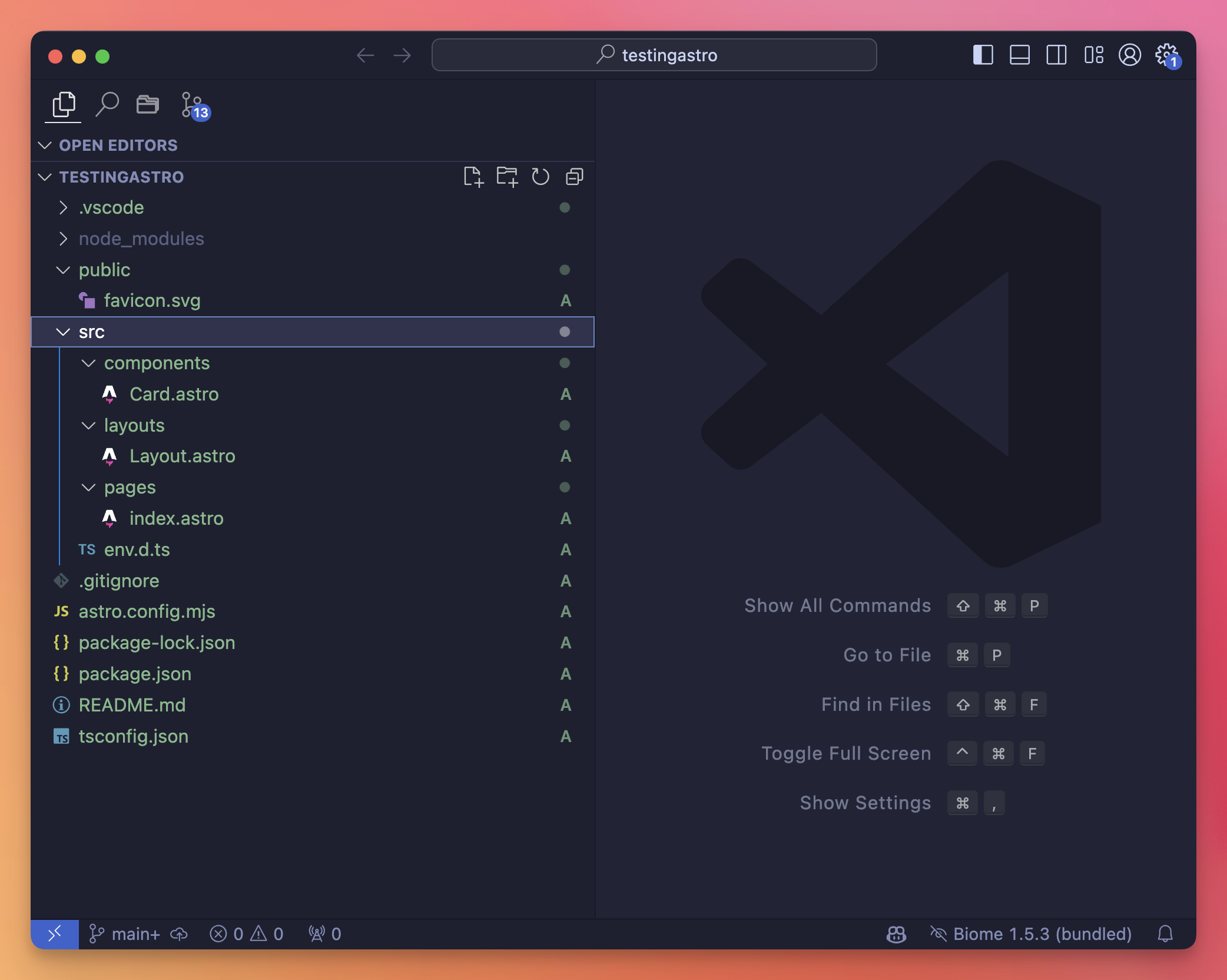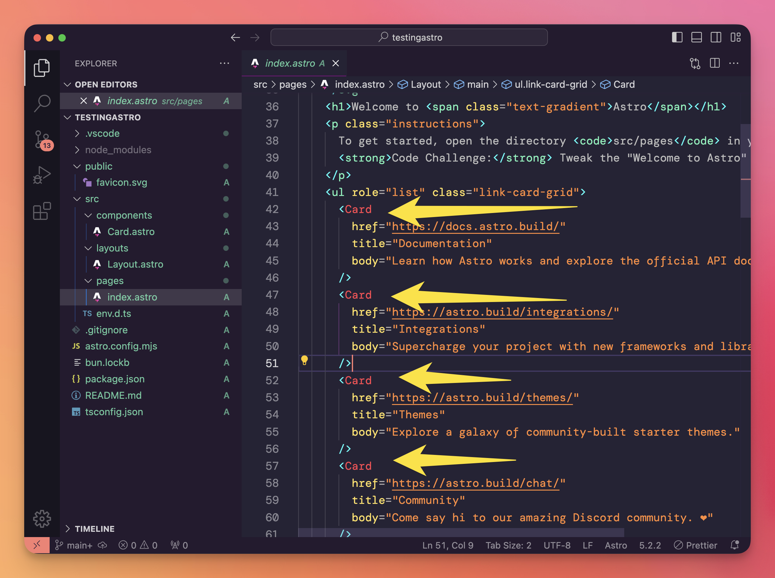 You now see src/pages/index.astro. This is the entry point for the / route, the one that serves the homepage.