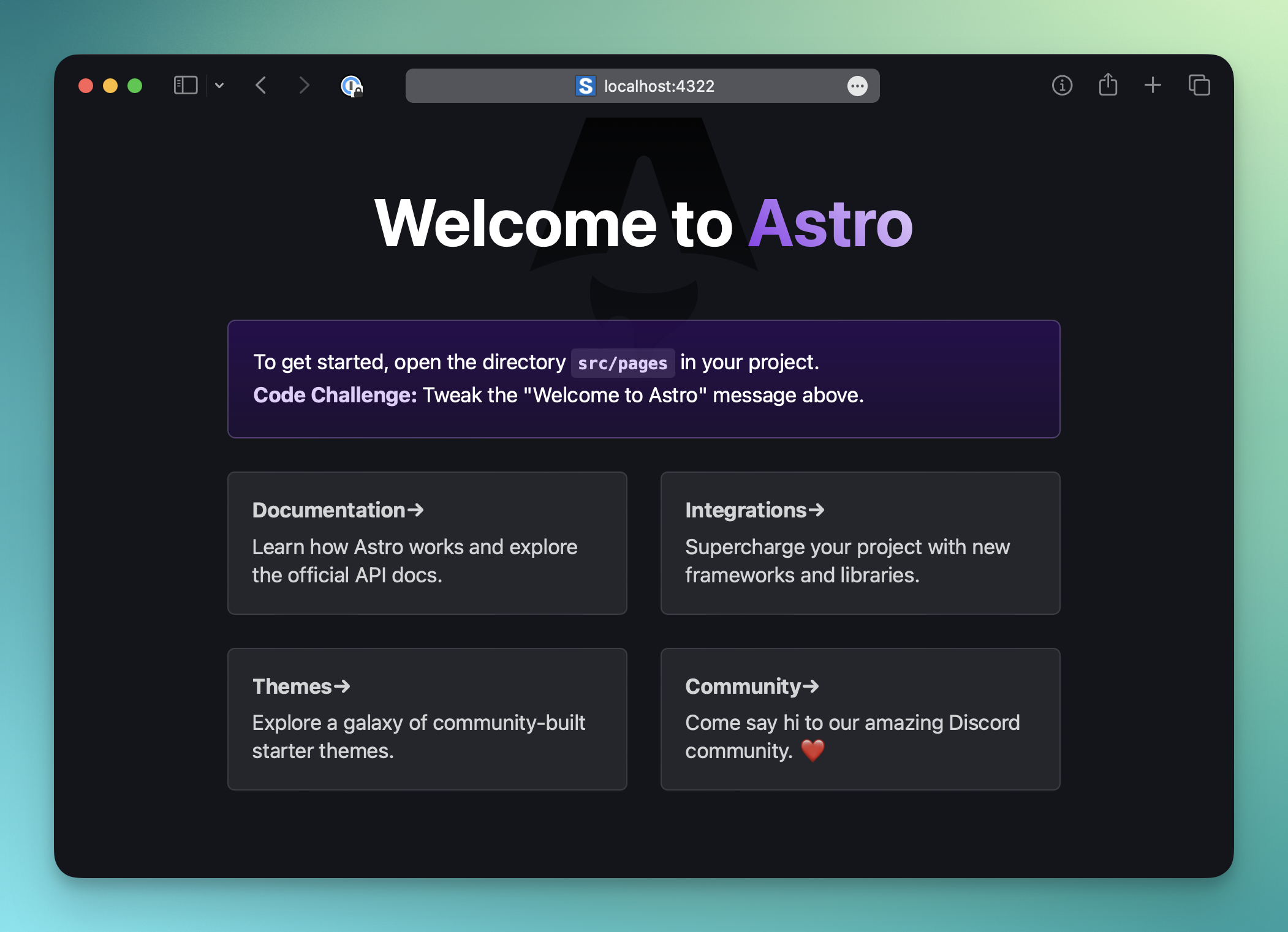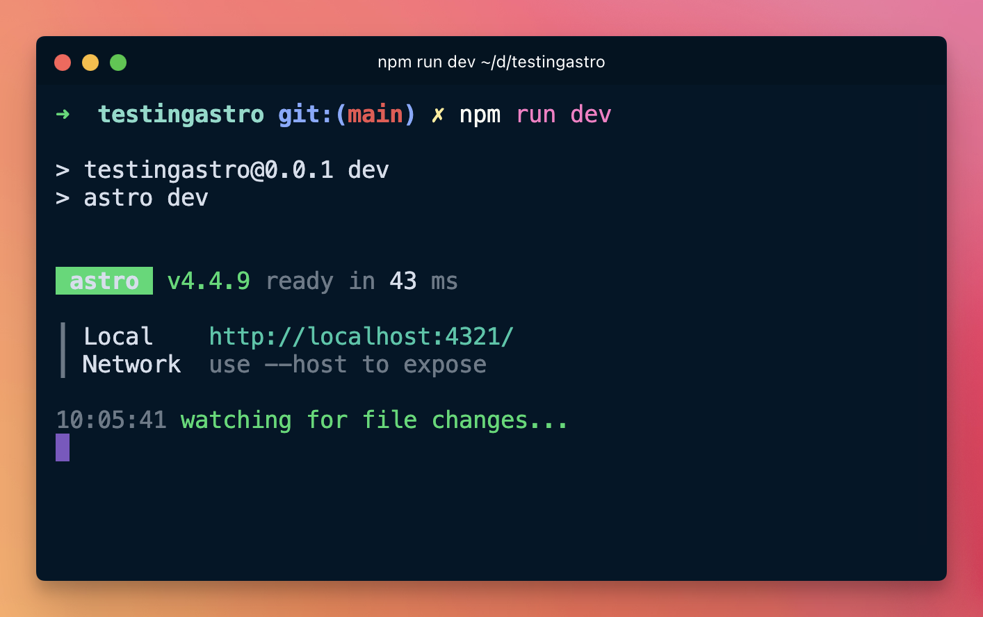 Astro will start on port 4321, unless you have other things running on that part, in which case port could be 4322 or another one.