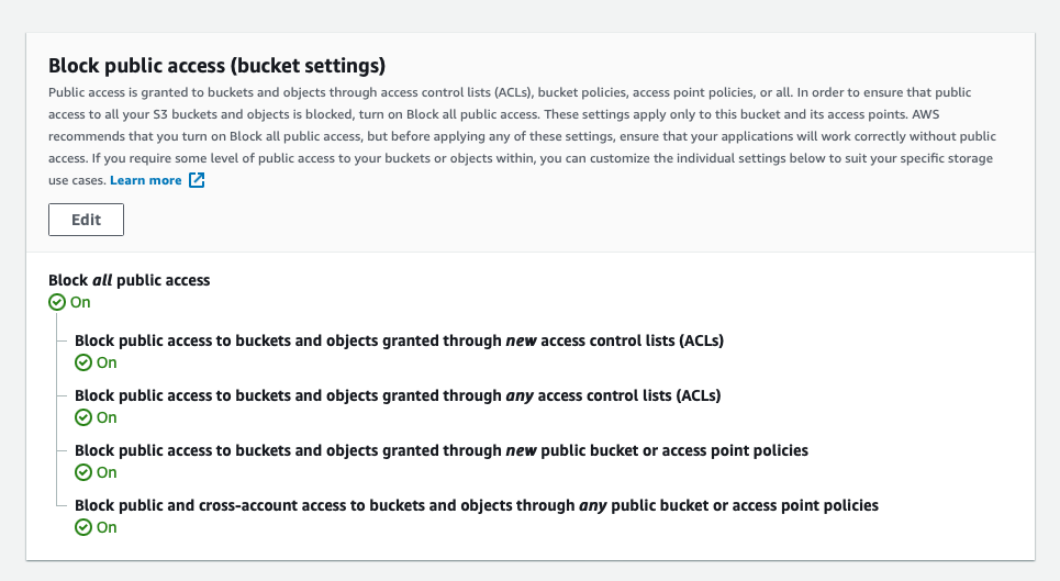 So first I tried to edit the “Block public access” setting, disabling the block I had: