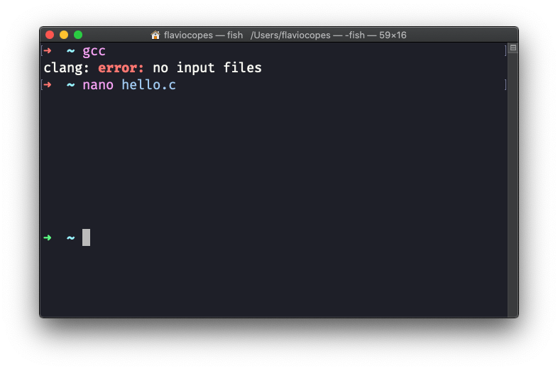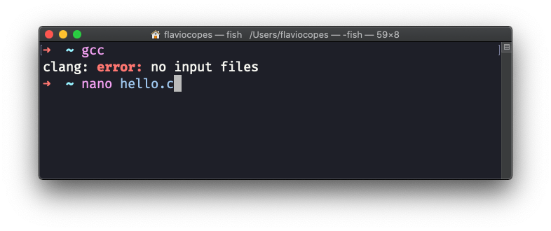 In any case, when you open the terminal window you can type gcc, and this command should return you an error saying that you didn’t specify any file: