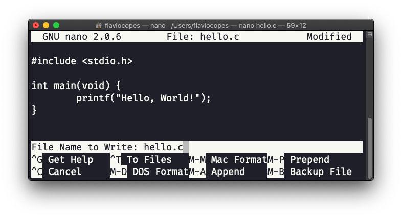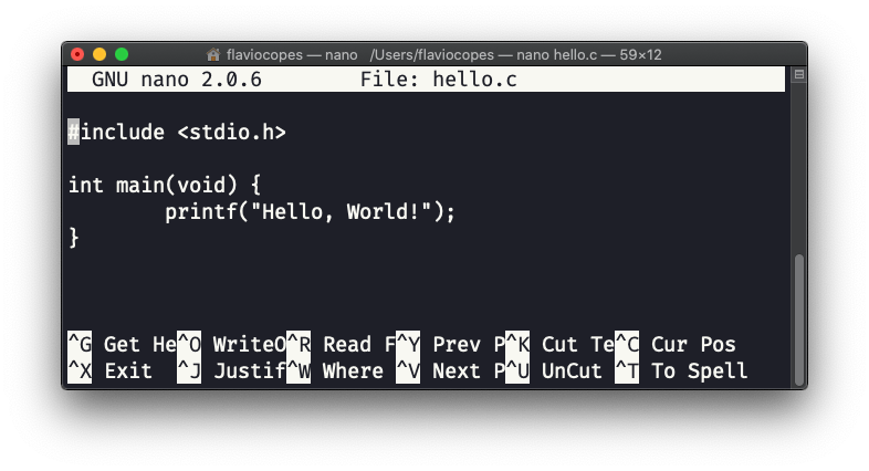 Now type the program above into a hello.c file. You can use any editor, but for the sake of simplicity I’m going to use the nano editor in the command line:
