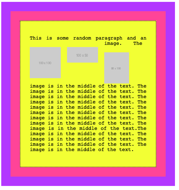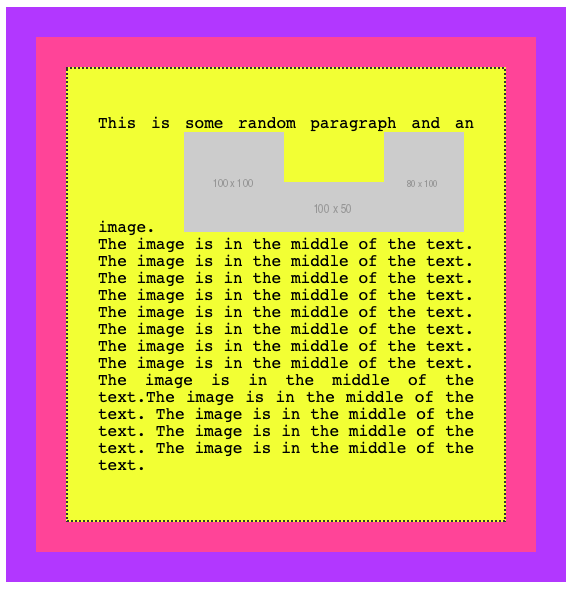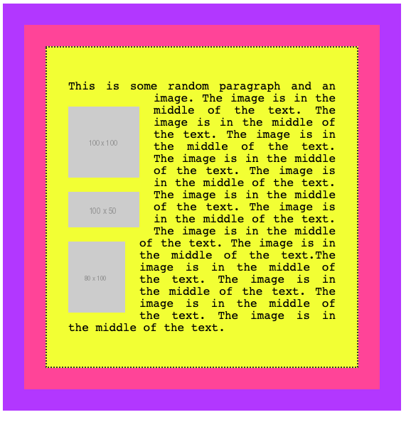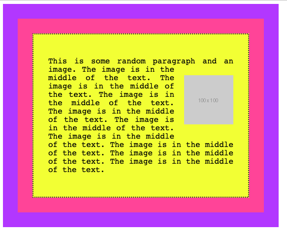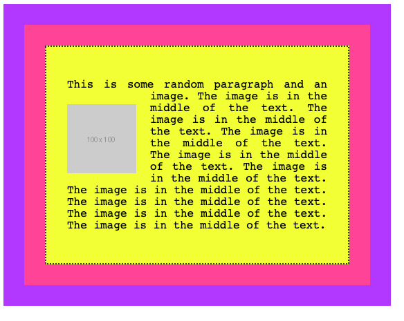 <p>This is some random paragraph and an image. <img src="https://via.placeholder.com/100x100" /> The image is in the middle of the text. The image is in the middle of the text. The image is in the middle of the text. The image is in the middle of the text. The image is in the middle of the text. The image is in the middle of the text. The image is in the middle of the text. The image is in the middle of the text. The image is in the middle of the text.