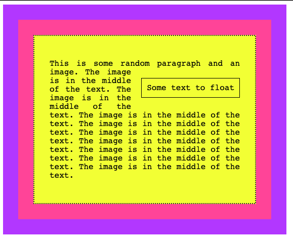 <p>This is some random paragraph and an image. <span>Some text to float</span> The image is in the middle of the text. The image is in the middle of the text. The image is in the middle of the text. The image is in the middle of the text. The image is in the middle of the text. The image is in the middle of the text. The image is in the middle of the text. The image is in the middle of the text. The image is in the middle of the text.