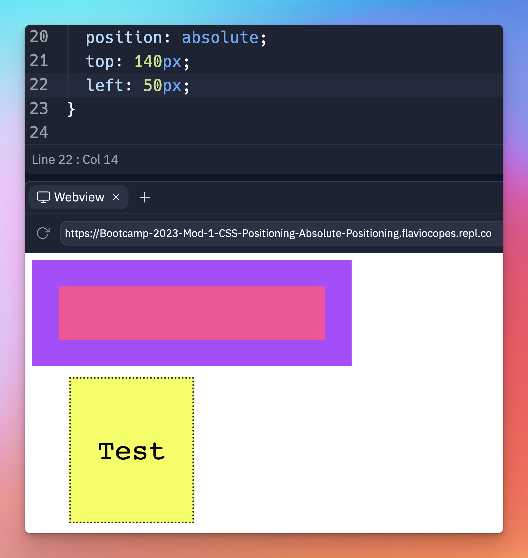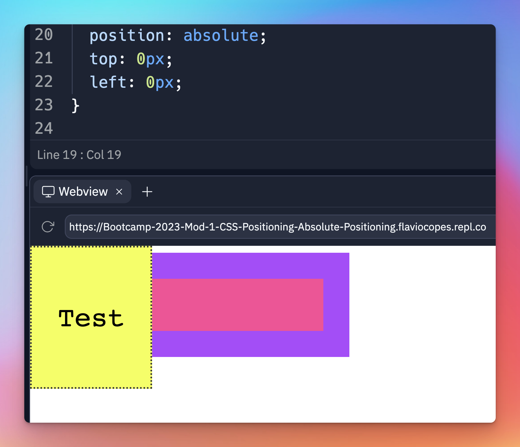 With absolute positioning, as soon as we set position: absolute on .box, its original space is now collapsed, and only the origin (the starting X and Y coordinates) remain the same.