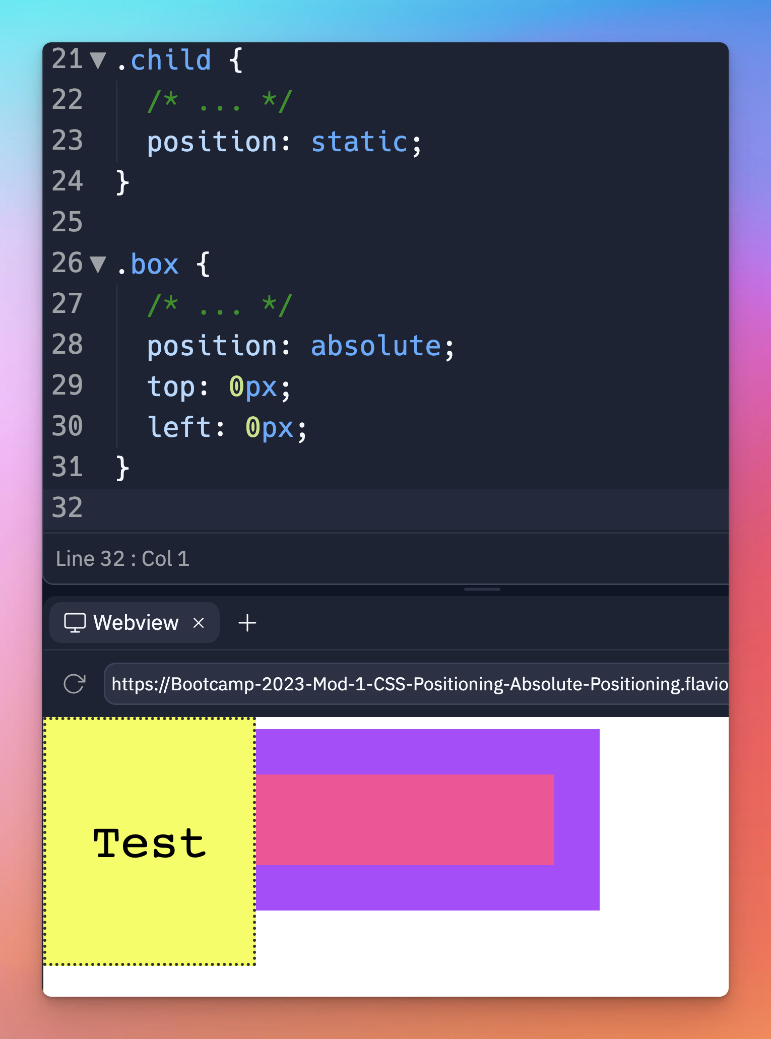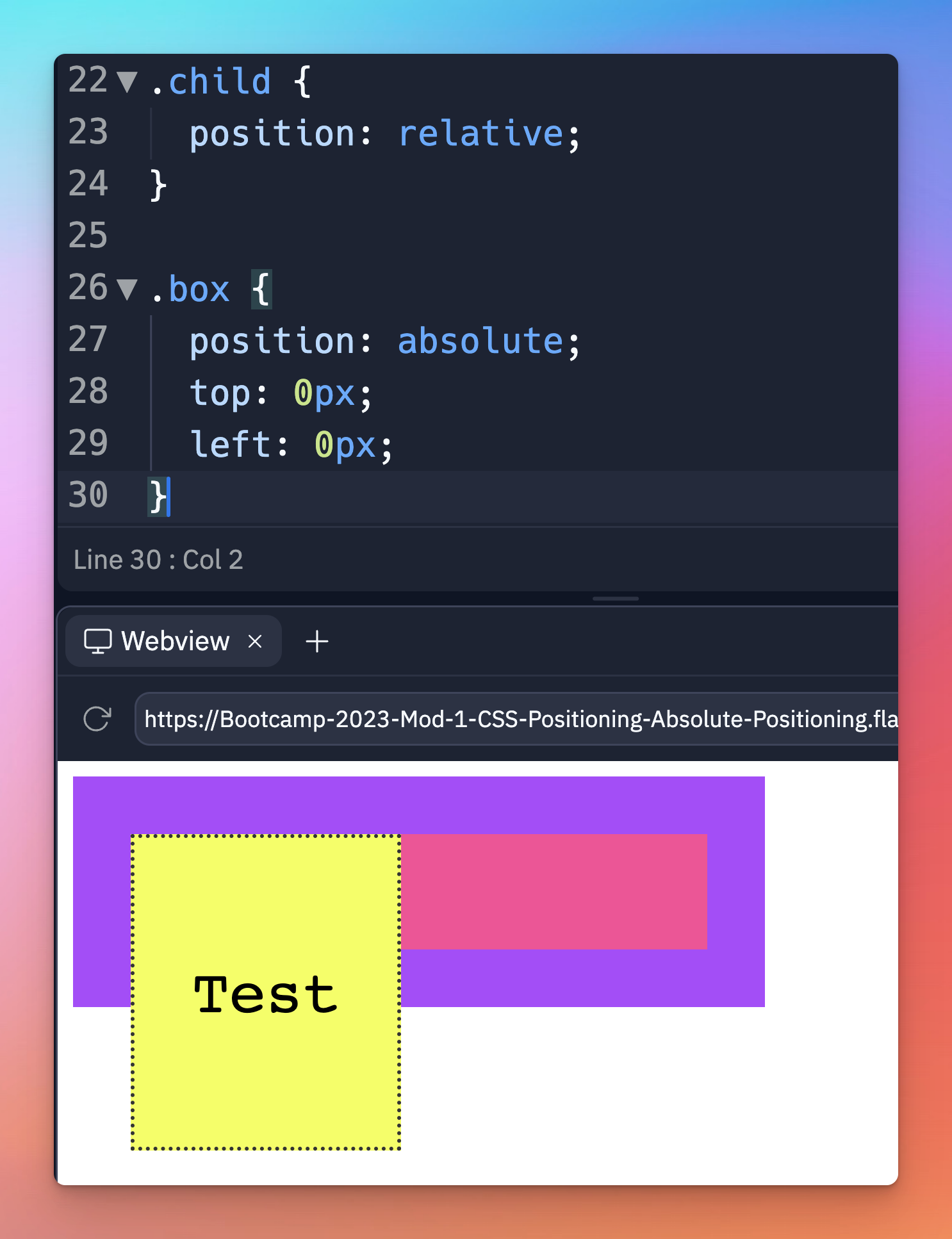 This means that if we add position: relative to the .child element, and we set top and left to 0, the box will not be positioned at the top left margin of the window, but rather it will be positioned at the 0, 0 coordinates of .child:
