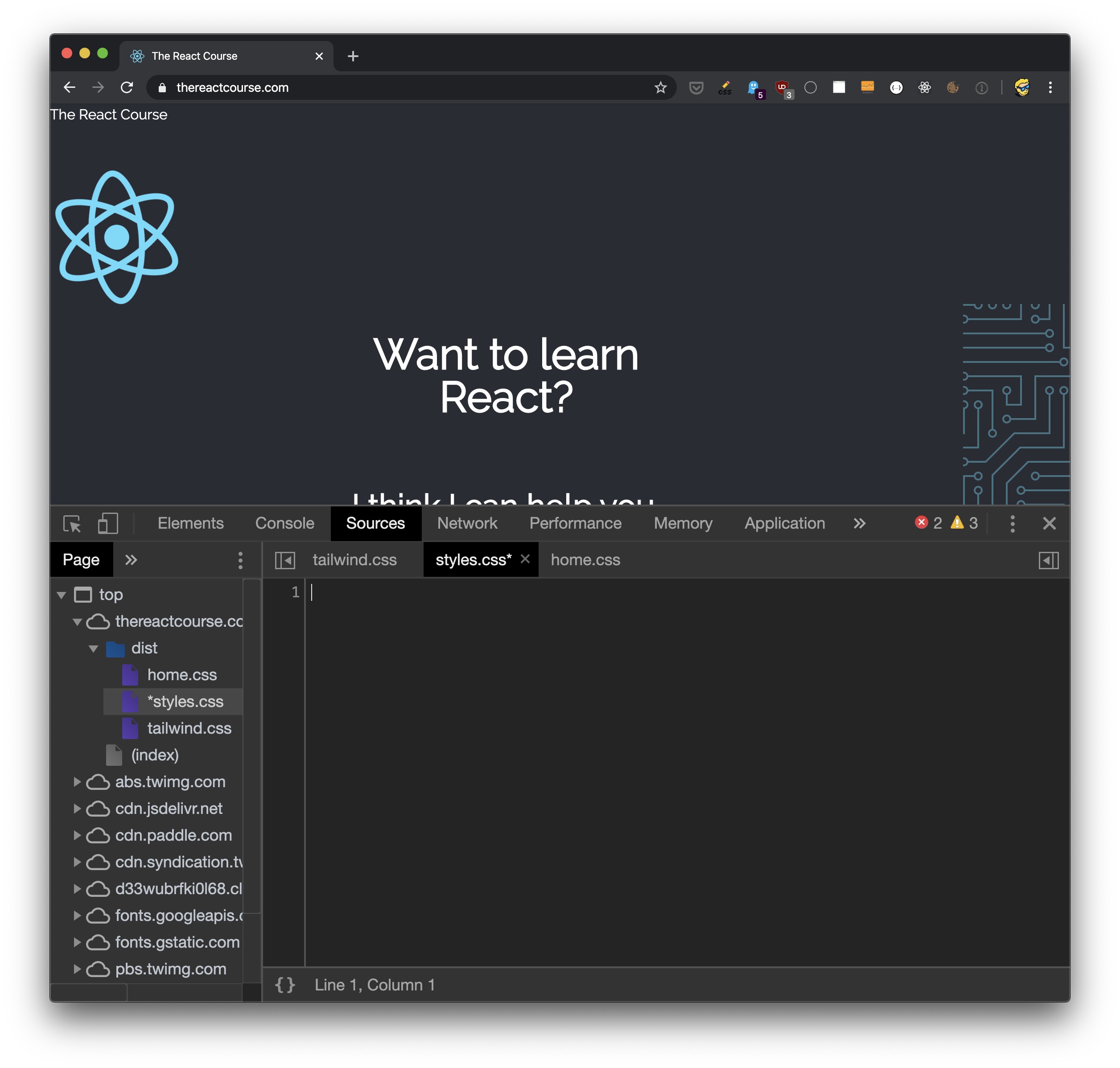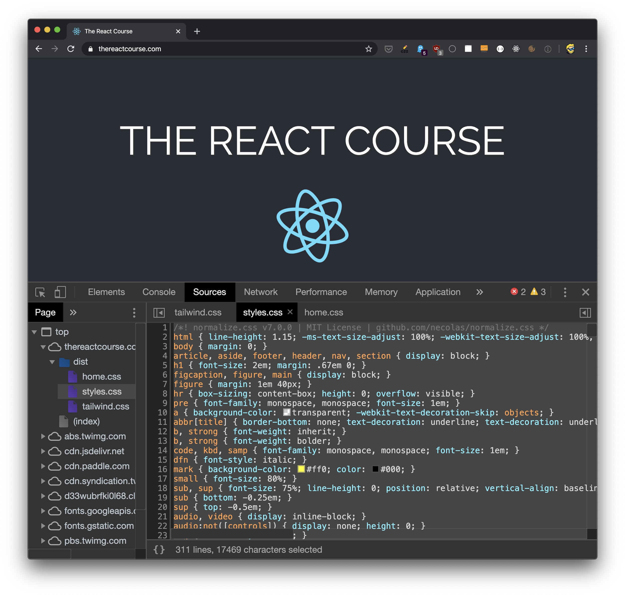 One way I know is to open the DevTools, in the Sources panel you’ll see the list of CSS files. You can remove the content in the CSS file in there, and the page will change. For example here’s my <thereactcourse.com> site.