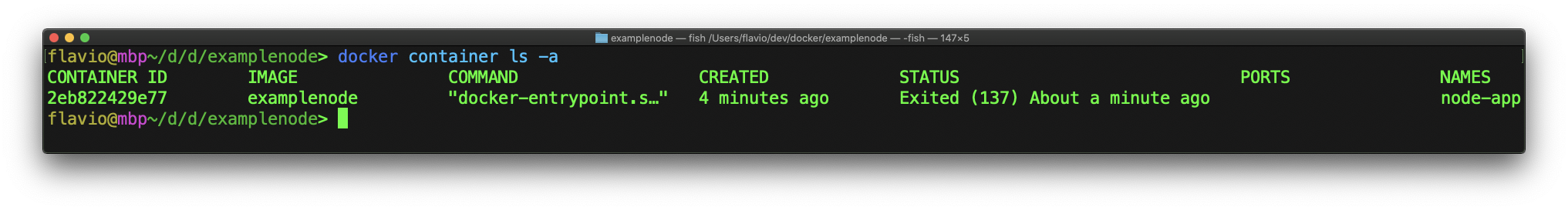 In this case, container with name node-app and ID 739037a911e0 generated from the image examplenode, created 4 minutes ago, is up since 4 minutes, and the port 80 of the host machine is mapped to the container port 3000 using the TCP protocol.