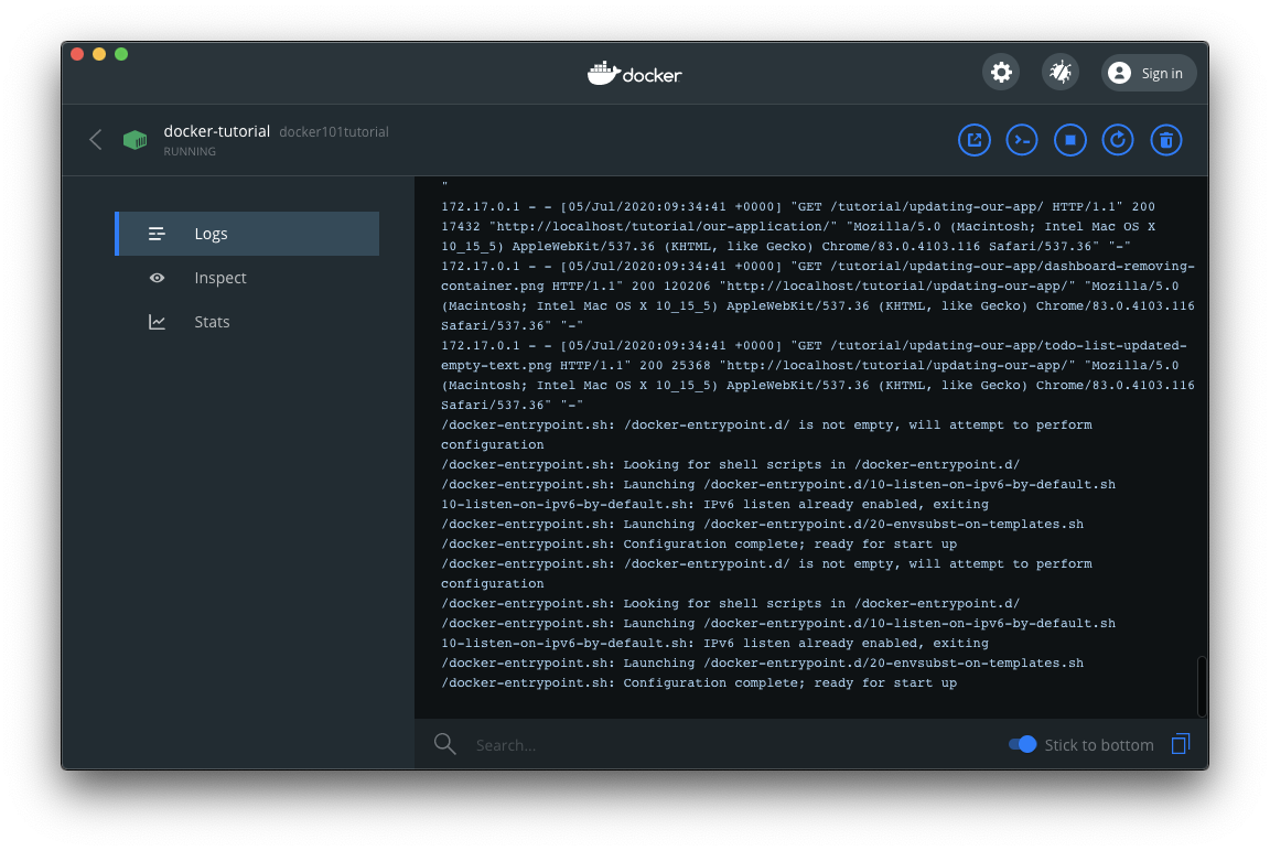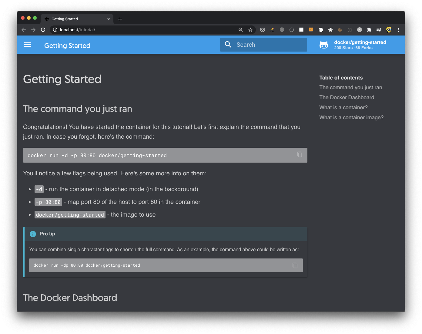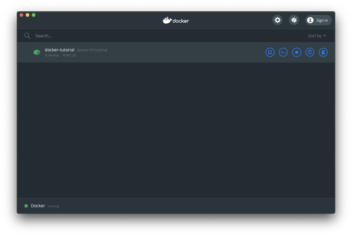 Once you start a Docker container, if you go and click the Docker icon in the toolbar and choose Dashboard, you will see it in Docker Desktop: