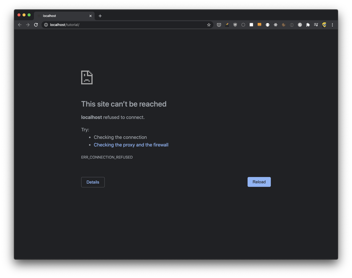 Go back and click the Open in browser button and the http://localhost/tutorial URL will open (http://localhost redirects to http://localhost/tutorial in this app):