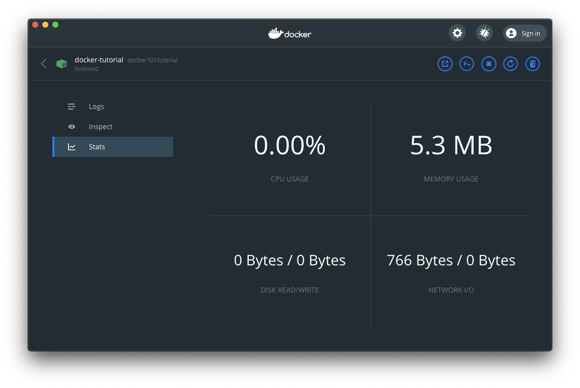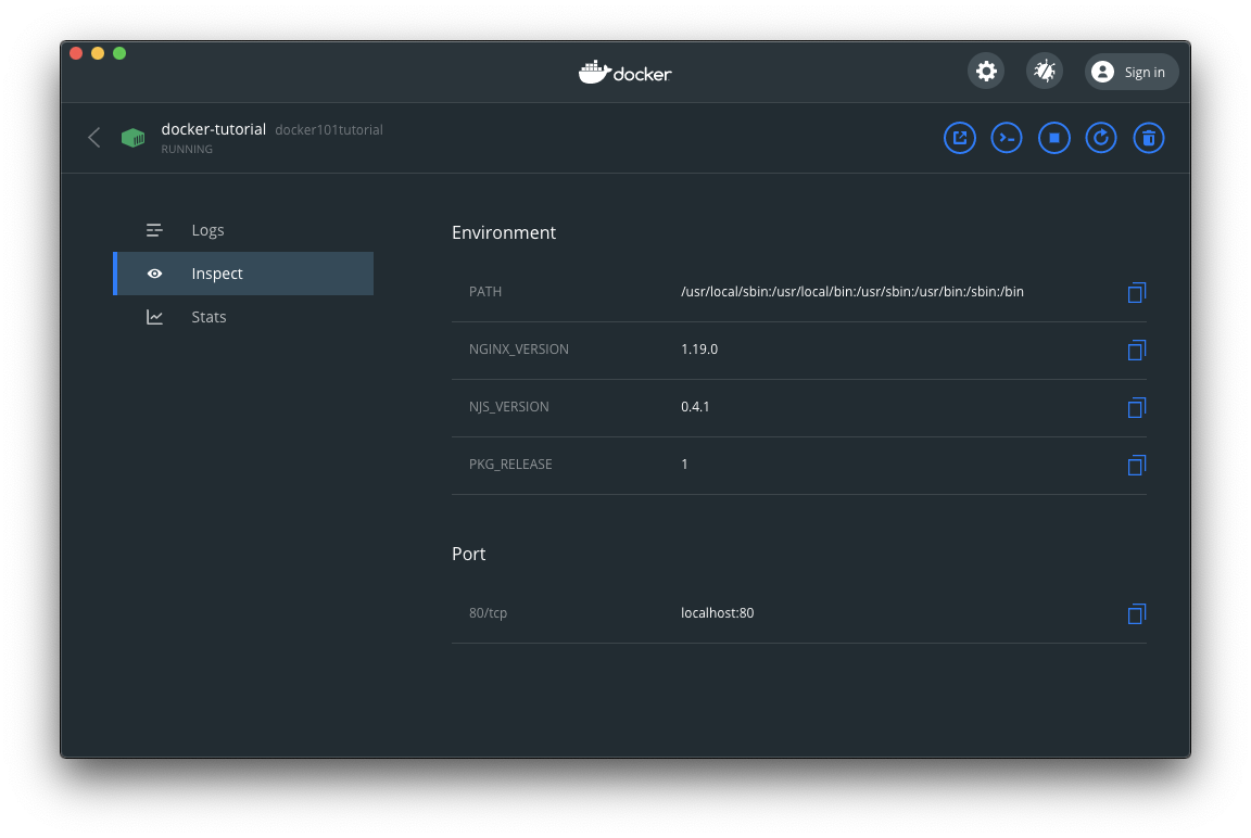 This is the content of a website that’s provided by our sample image. Now go back to Docker Desktop and press the Stop button