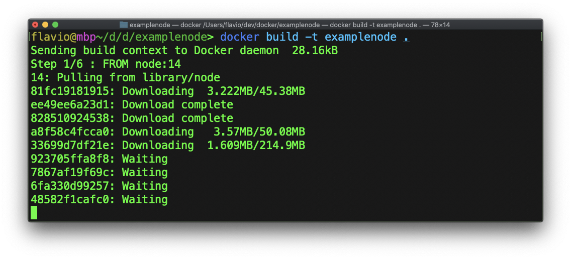 It’s important to note that after you first download a base image like the node one we use here, that will be cached locally, so you don’t need to download it again and the image building process will be much faster.