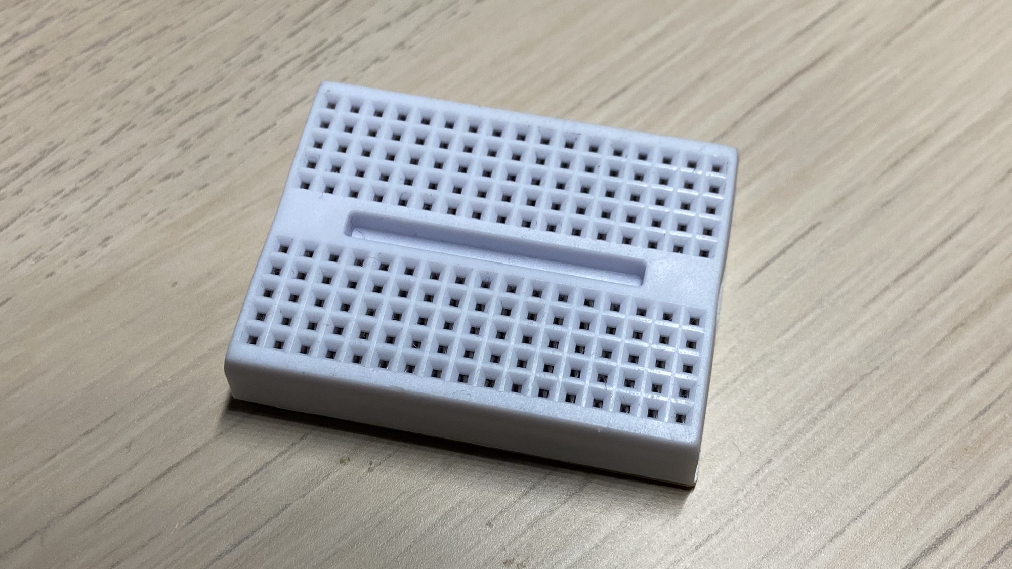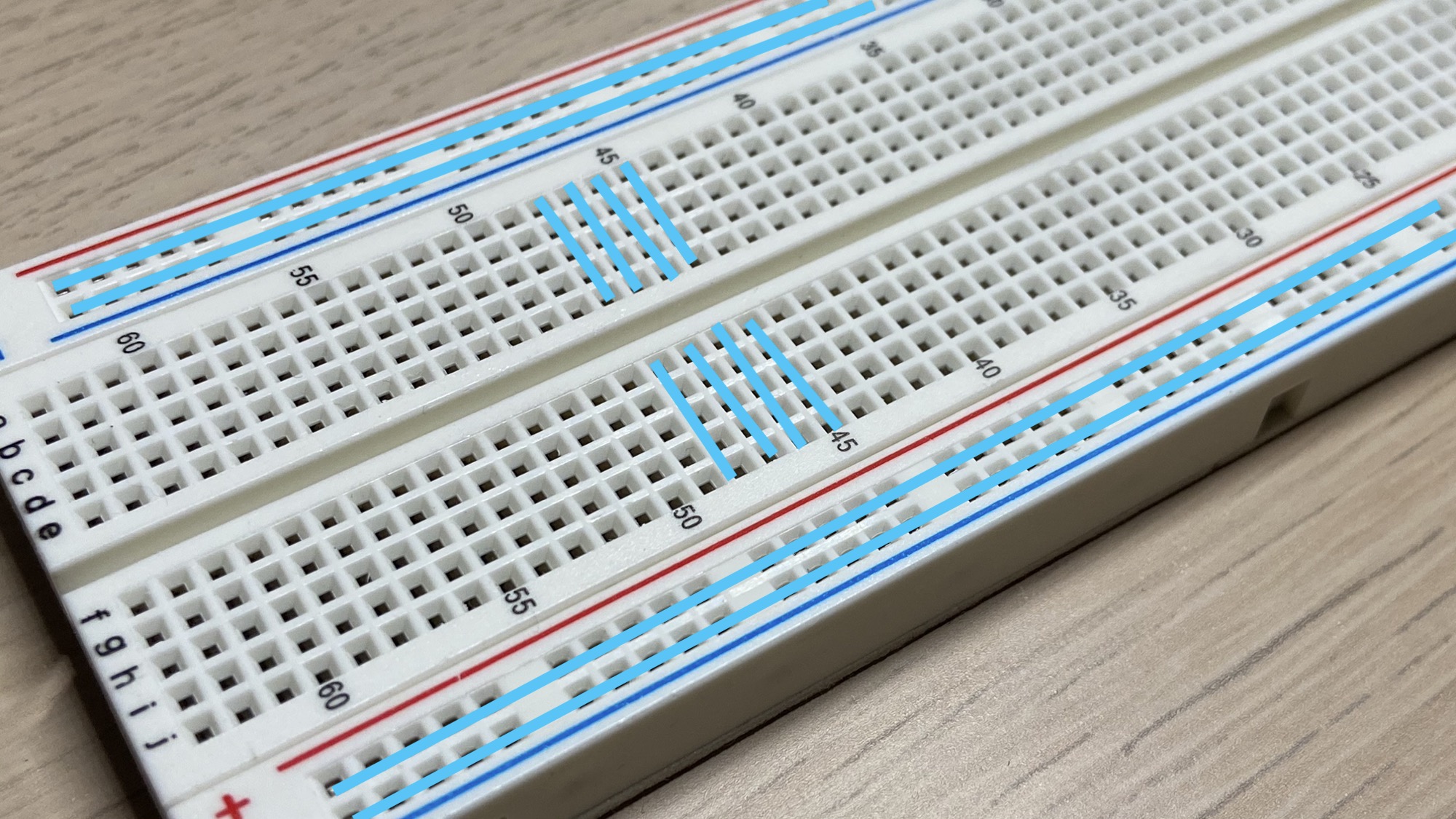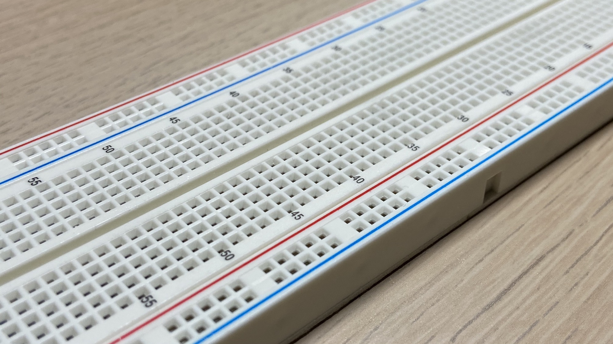 The breadboard has 17 sets of 5 interconnected elements on one side, and 17 sets of interconnected elements on another side.