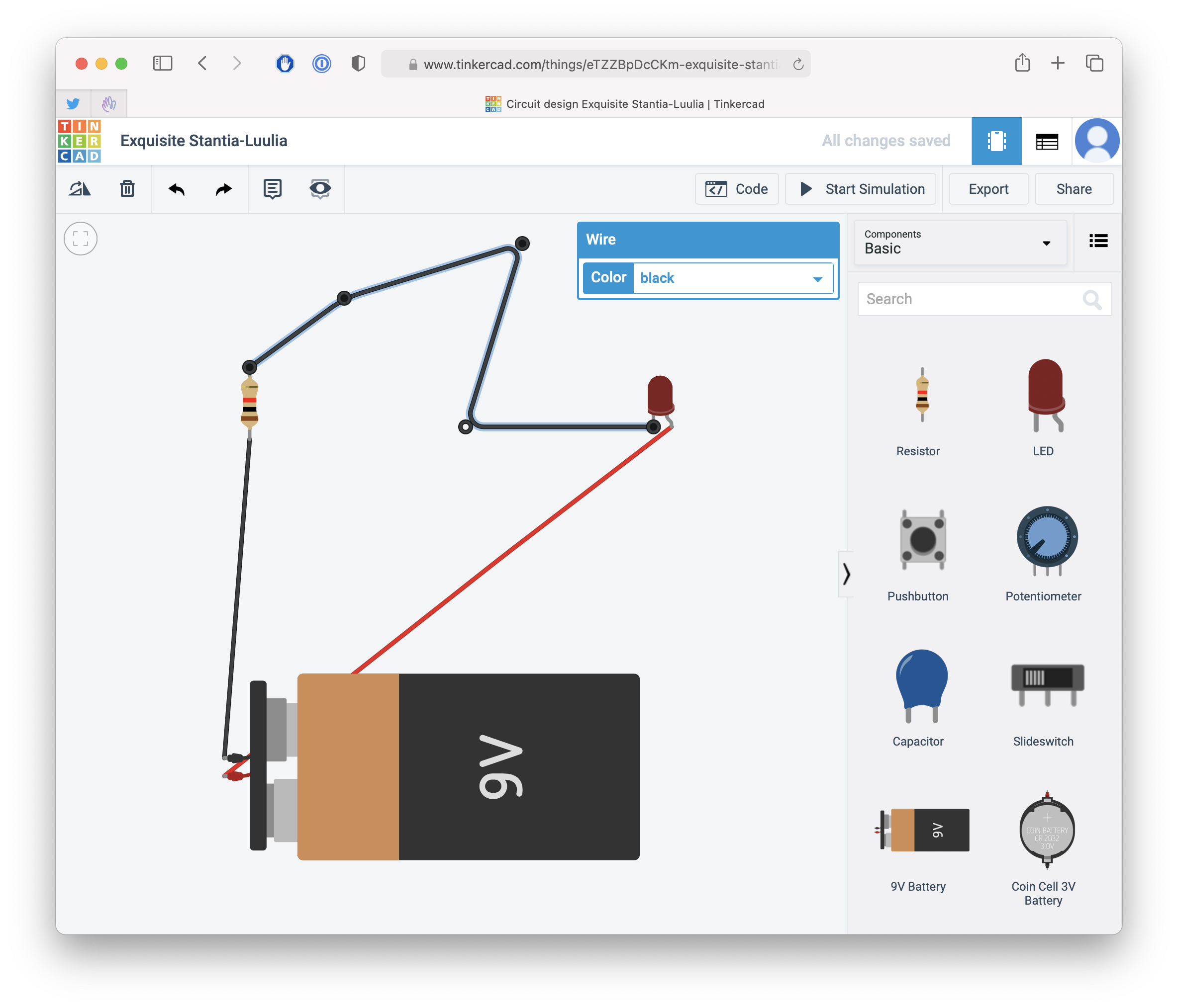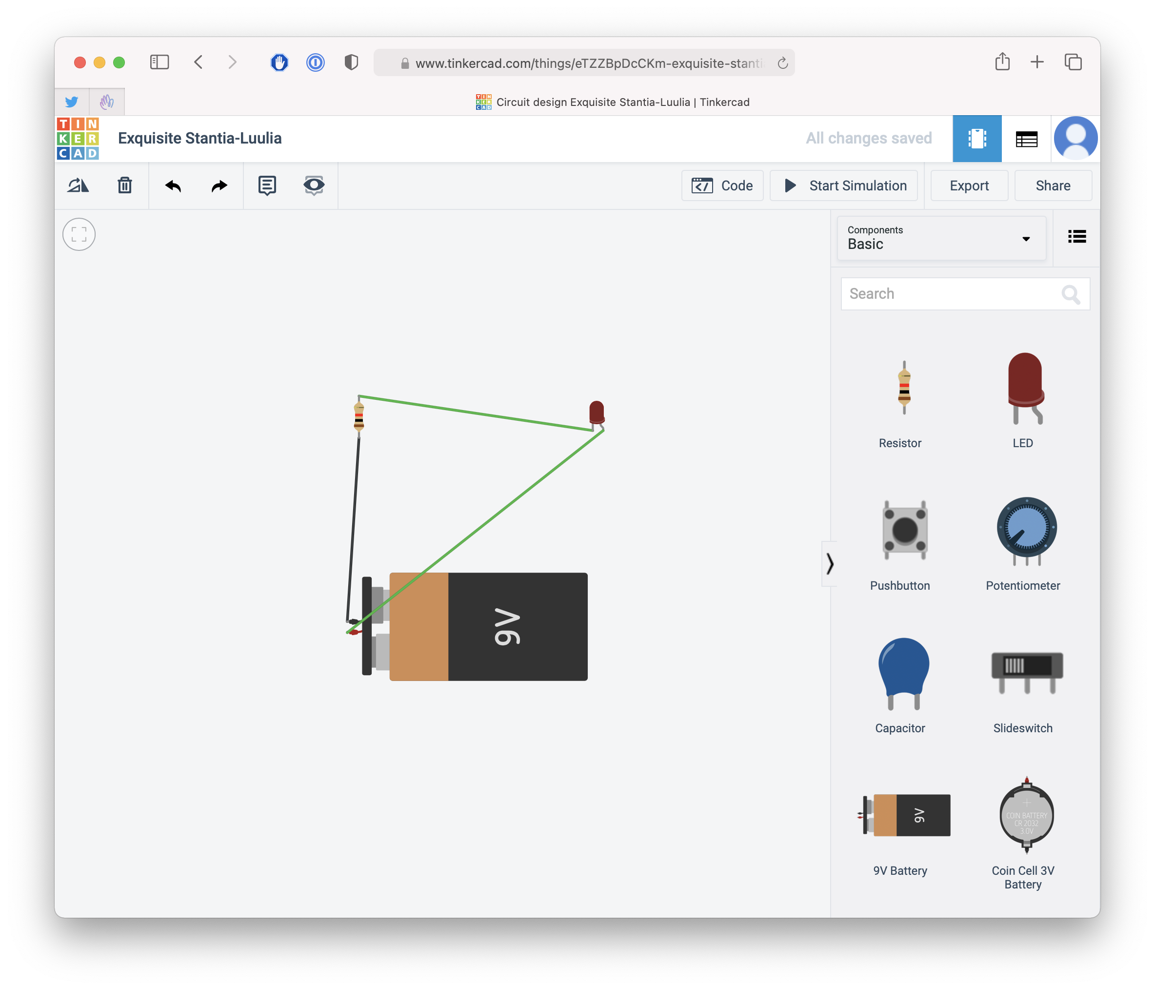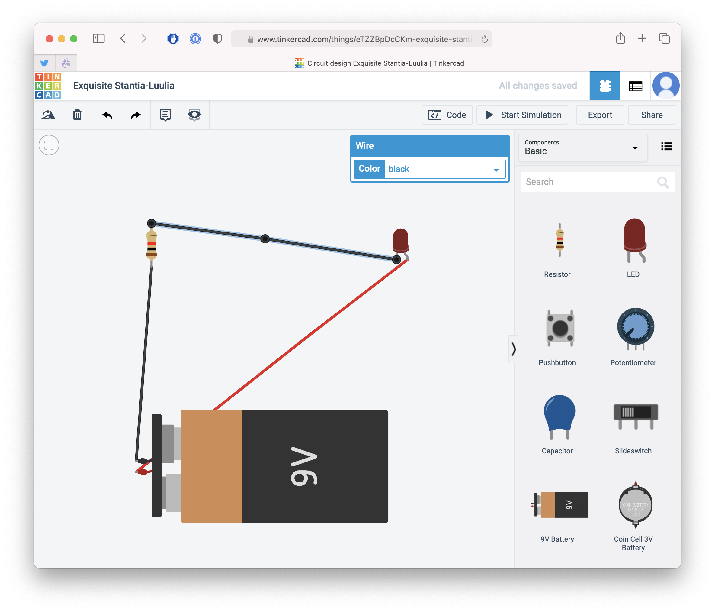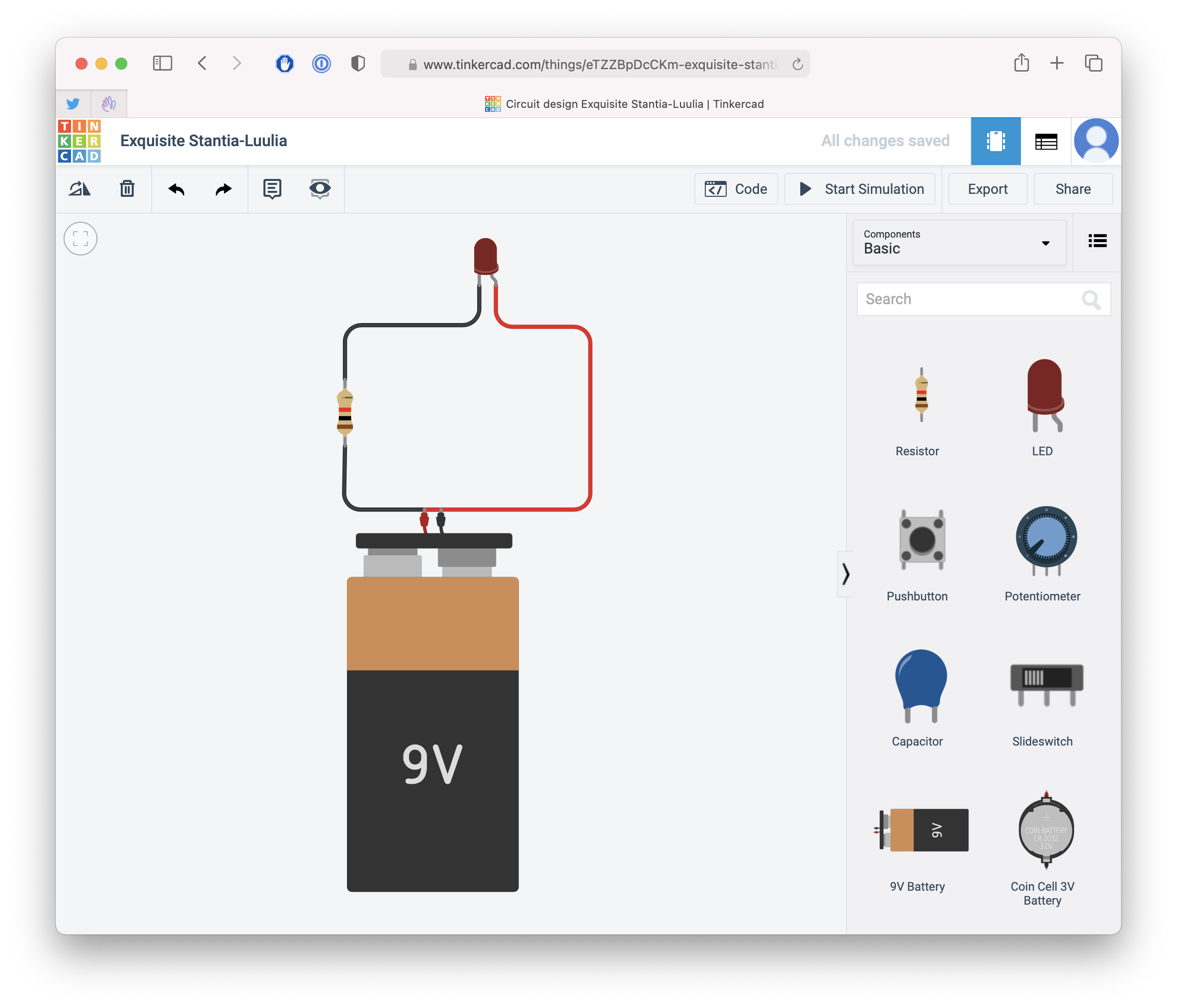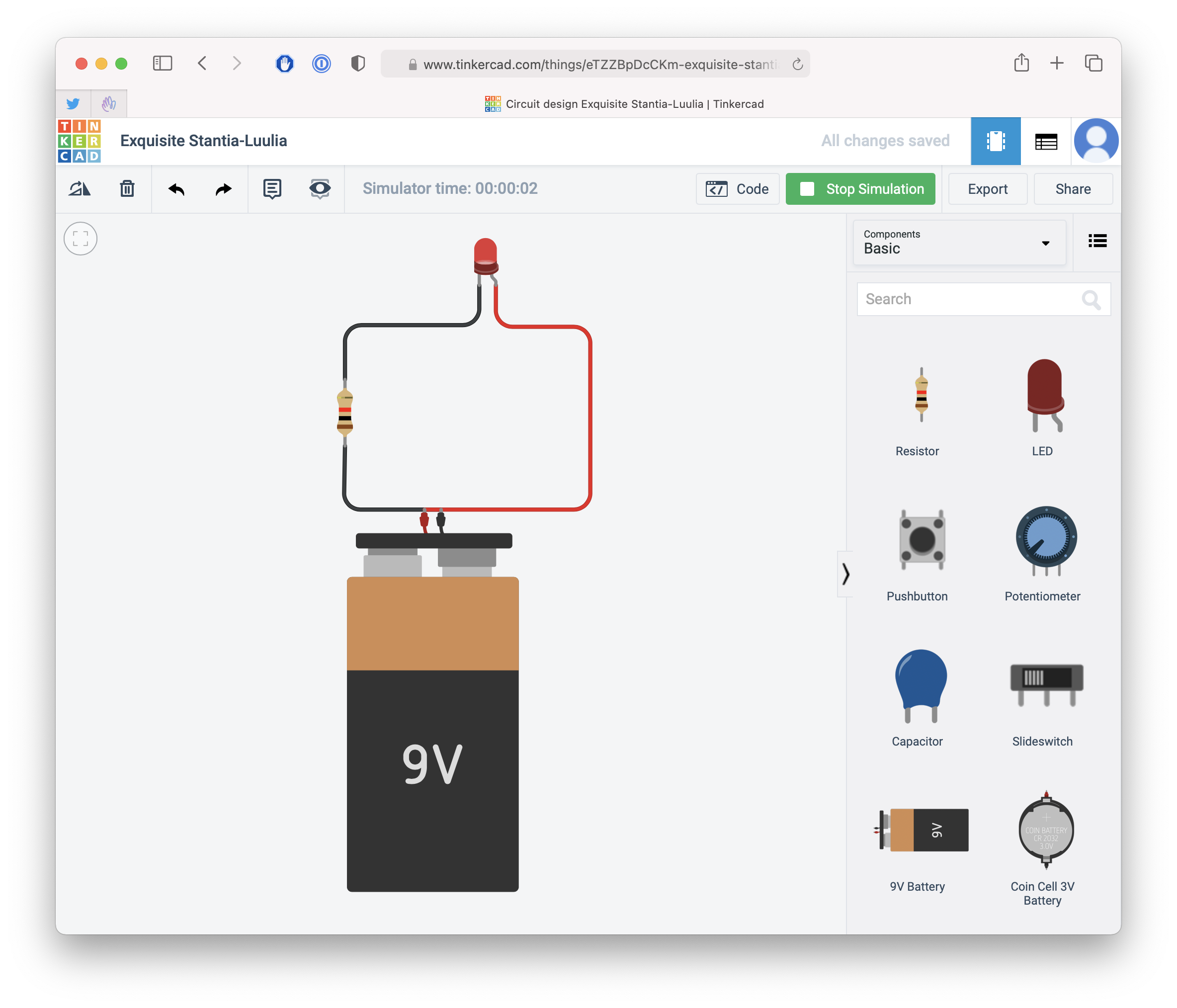 Now click the Start simulation button. You will see the LED light up, until you click Stop simulation:
