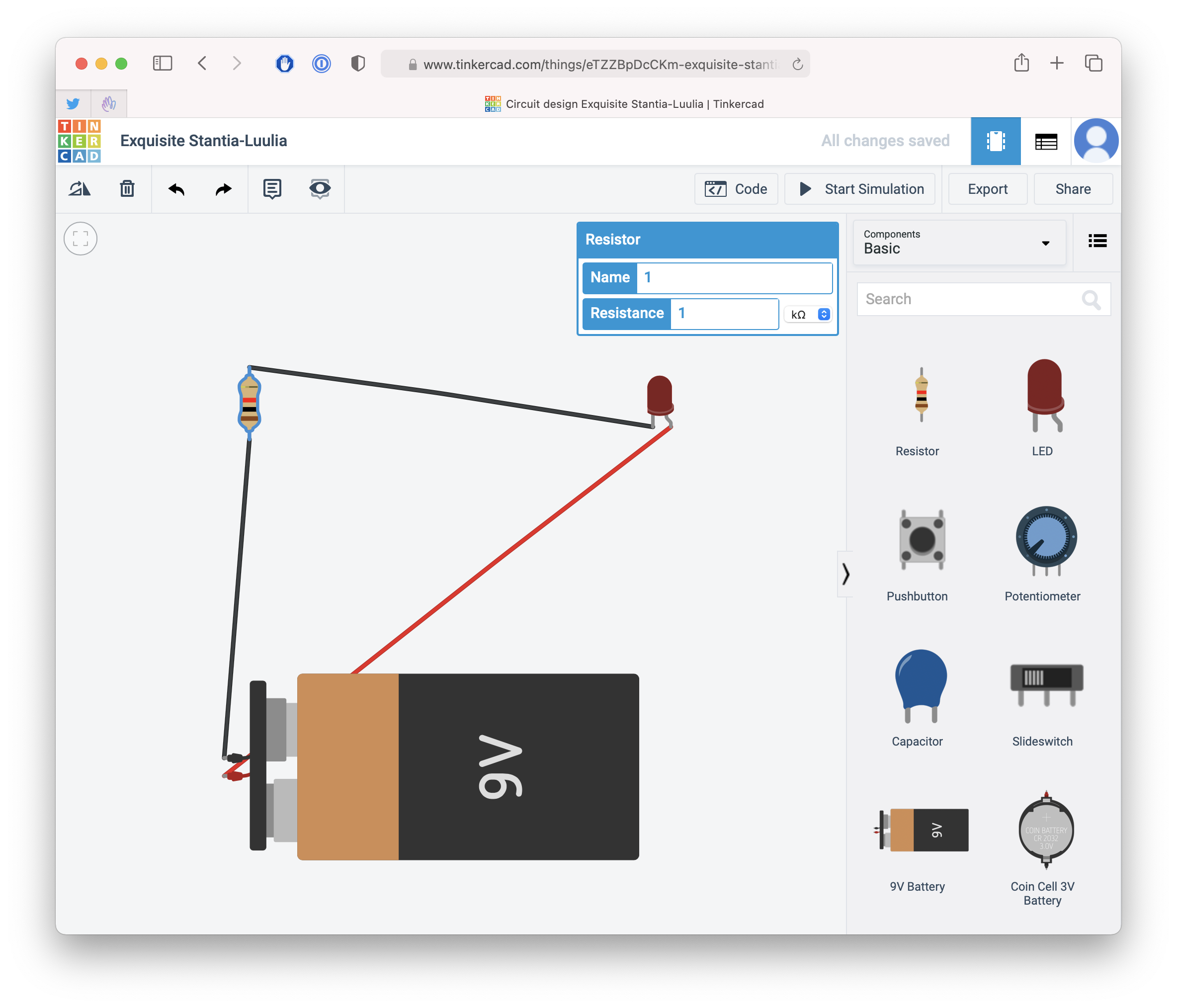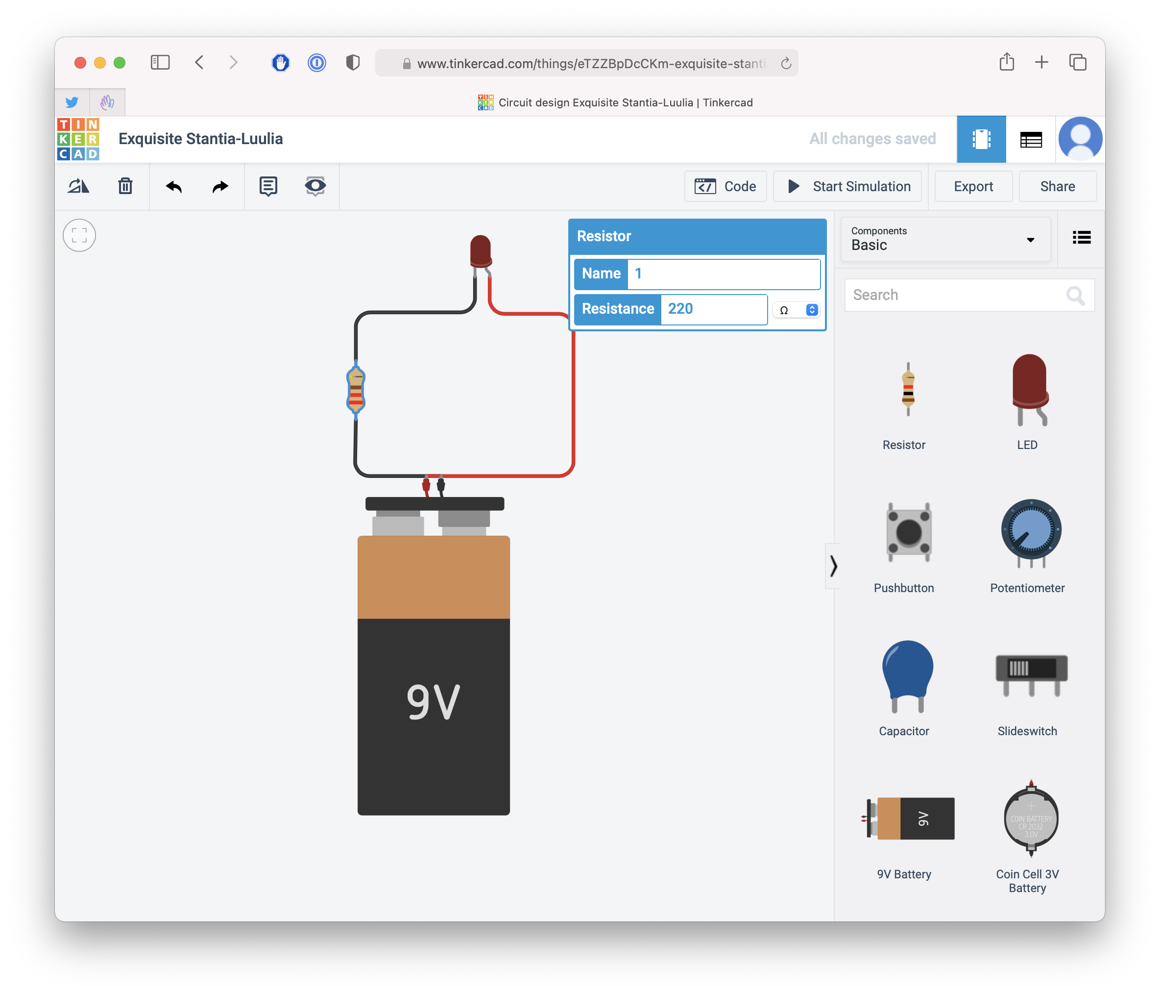 You can also change the value of the resistor while the simulation is running. If you write 1000Ω instead of 220, you will see the light on the led will be less bright.