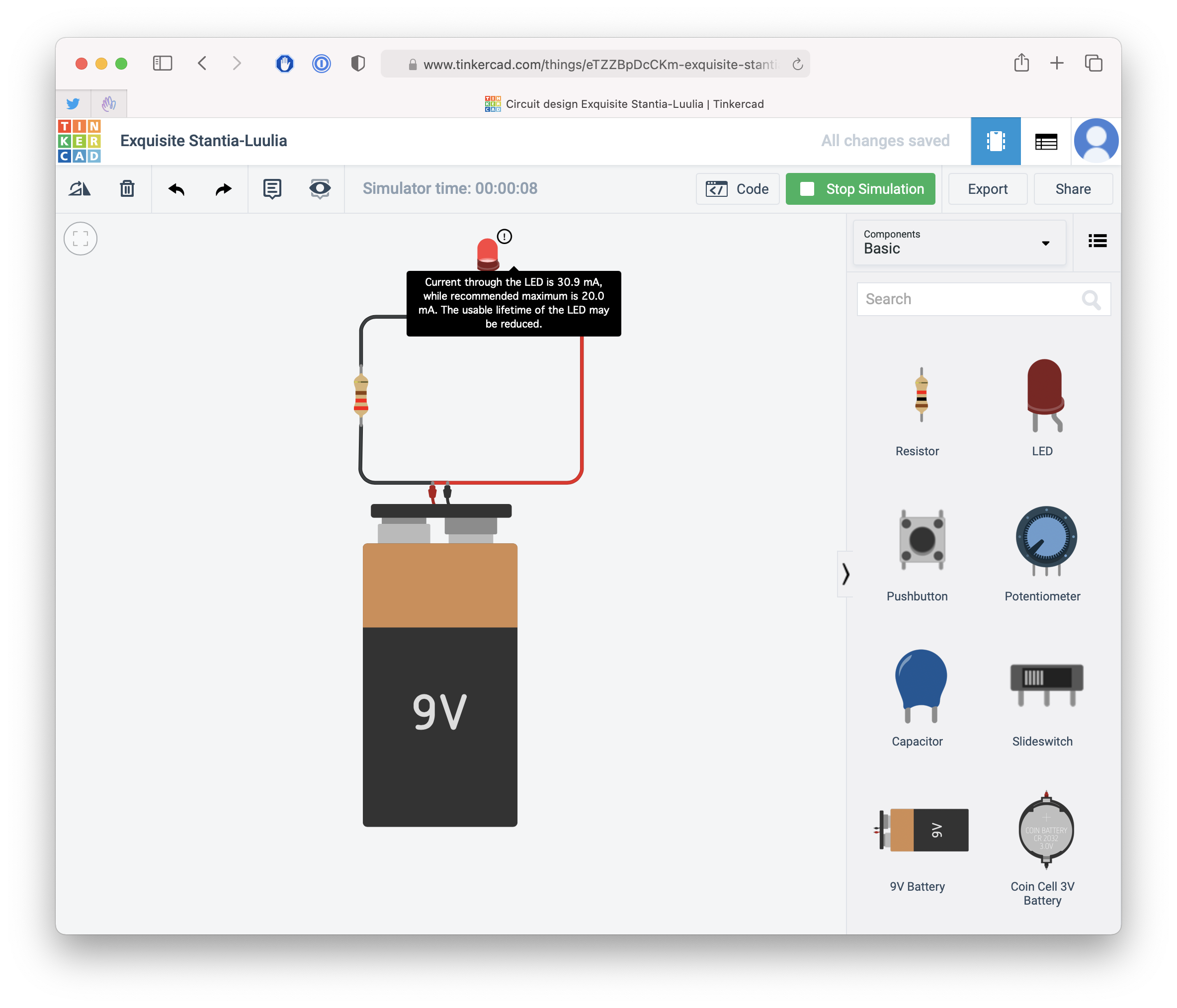 Run the simulation again, and you will see a warning on the LED, informing you the current flowing through is too much, and 20mA is the recommended maximum amount of current the LED can handle: