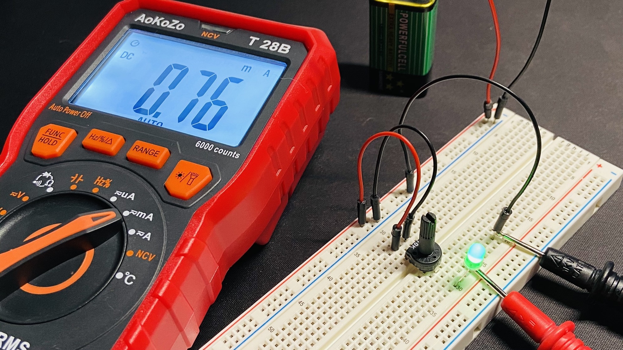 To measure current let’s build a little circuit. In this case I have a potentiometer that lights a LED.