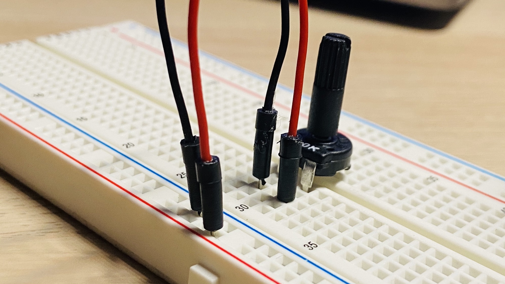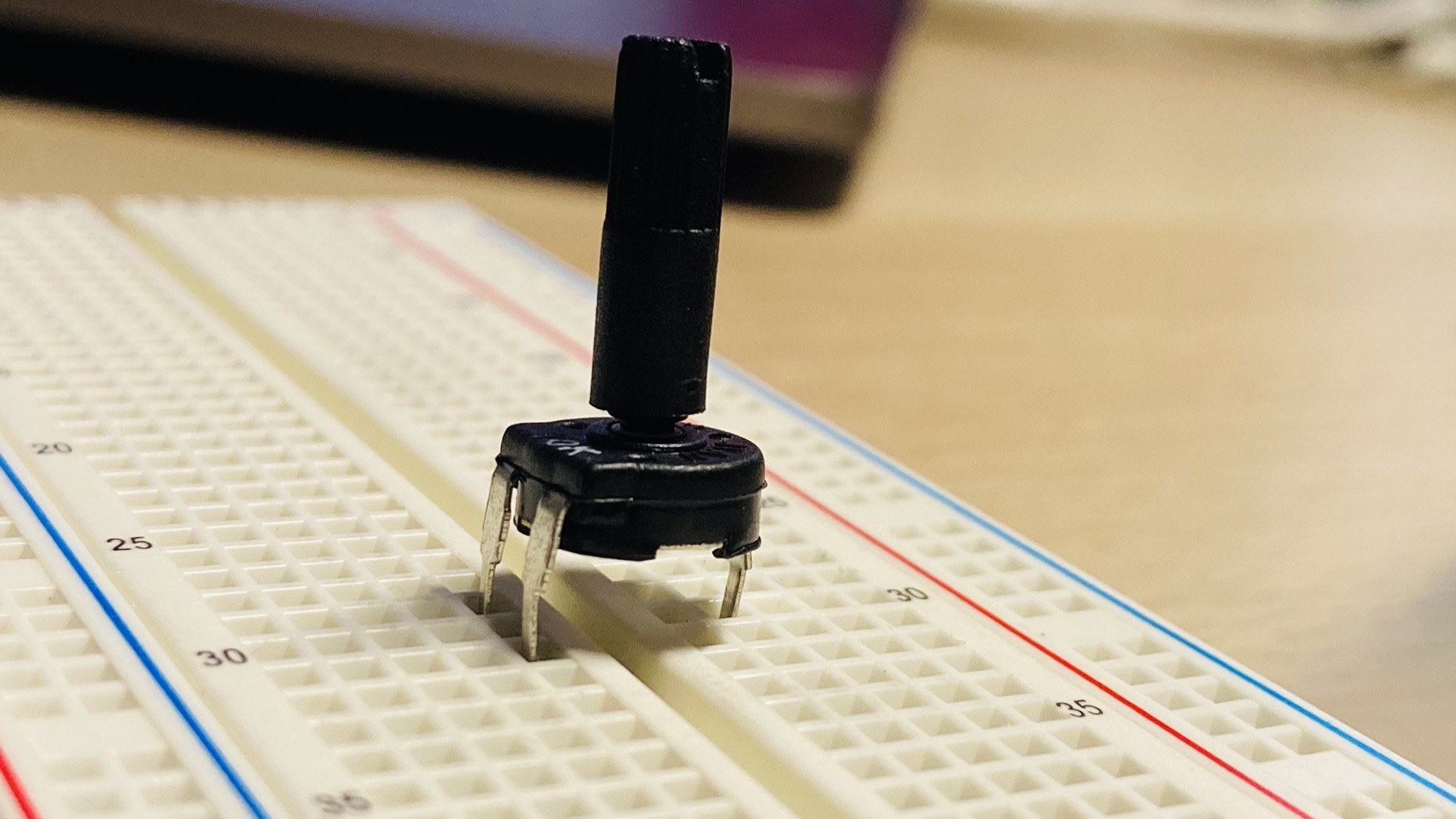 Start by putting the potentiometer on the board, in any place you want, with the 2 input pins on one side of the board, and 1 output pin on the other side: