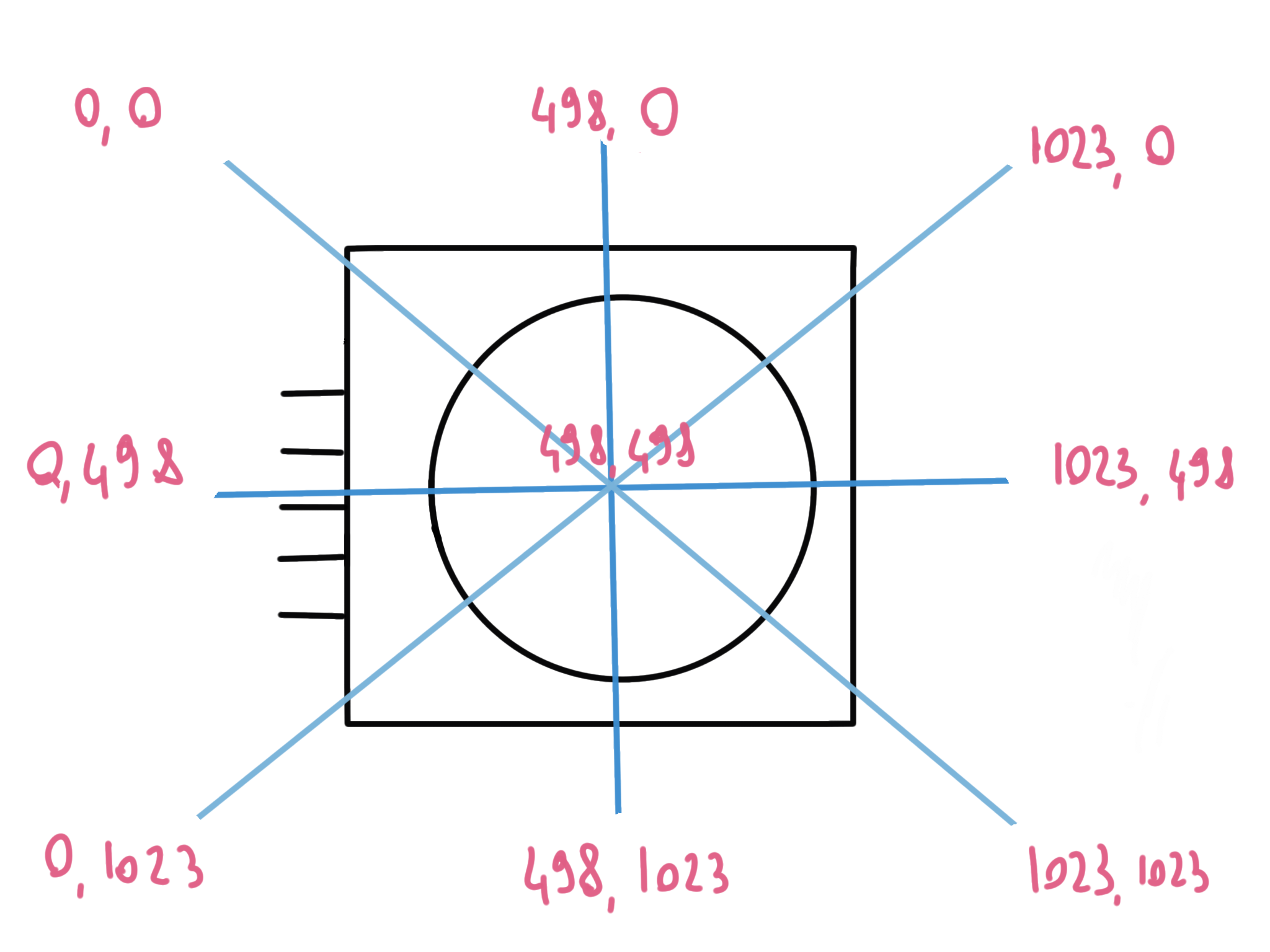 When watching the joystick with the pins on the left, the X axis values assumes values from 0 (full left) to 1023 (full right) and 498 in the middle. The Y axis values assumes values from 0 (top) to 1023 (bottom) and 498 in the middle.