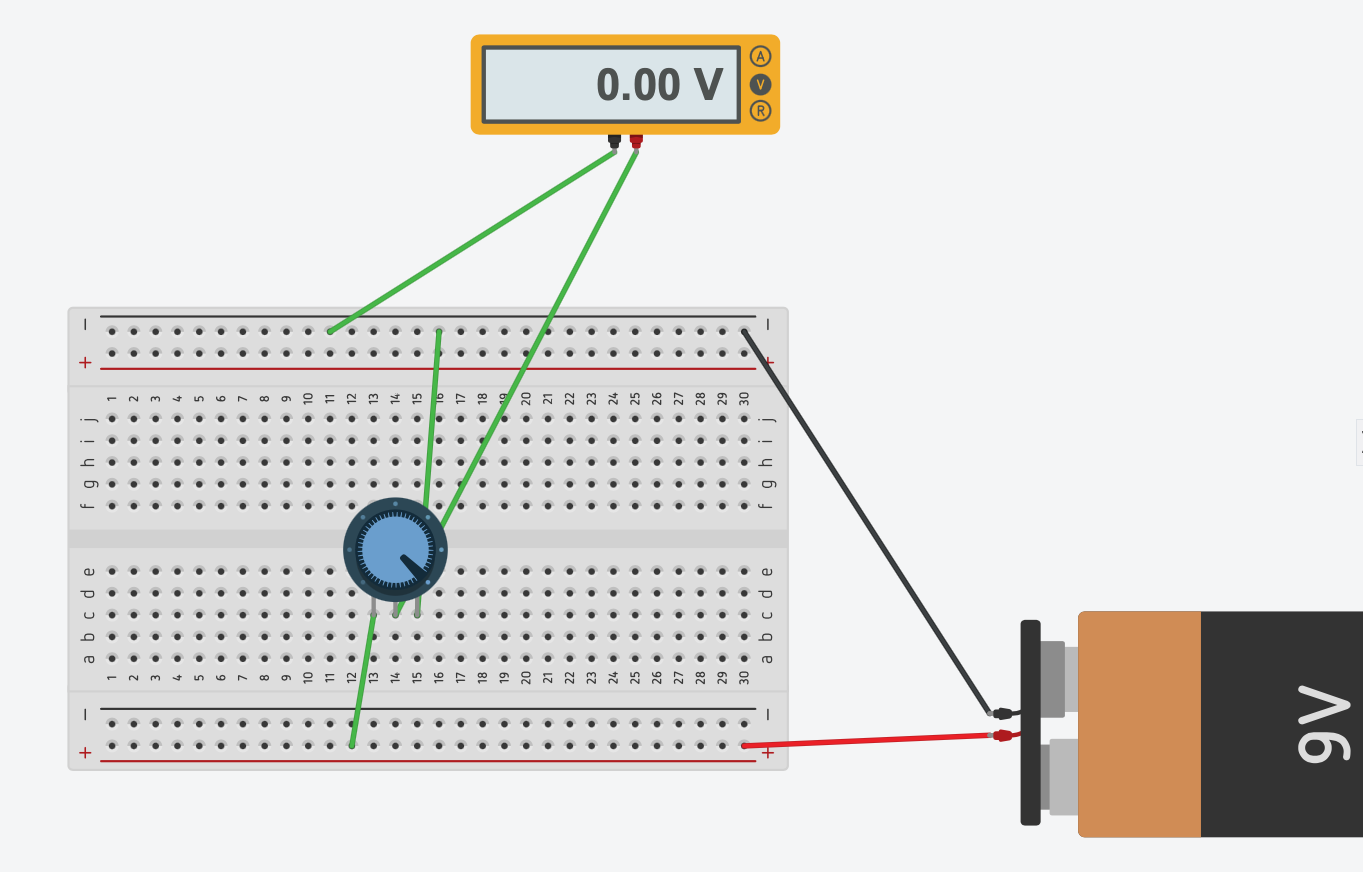 If we change the potentiometer value at full right, on the output pin we have 9V because the potentiometer does not absorb any current. It works like a wire, applying 0 resistance.