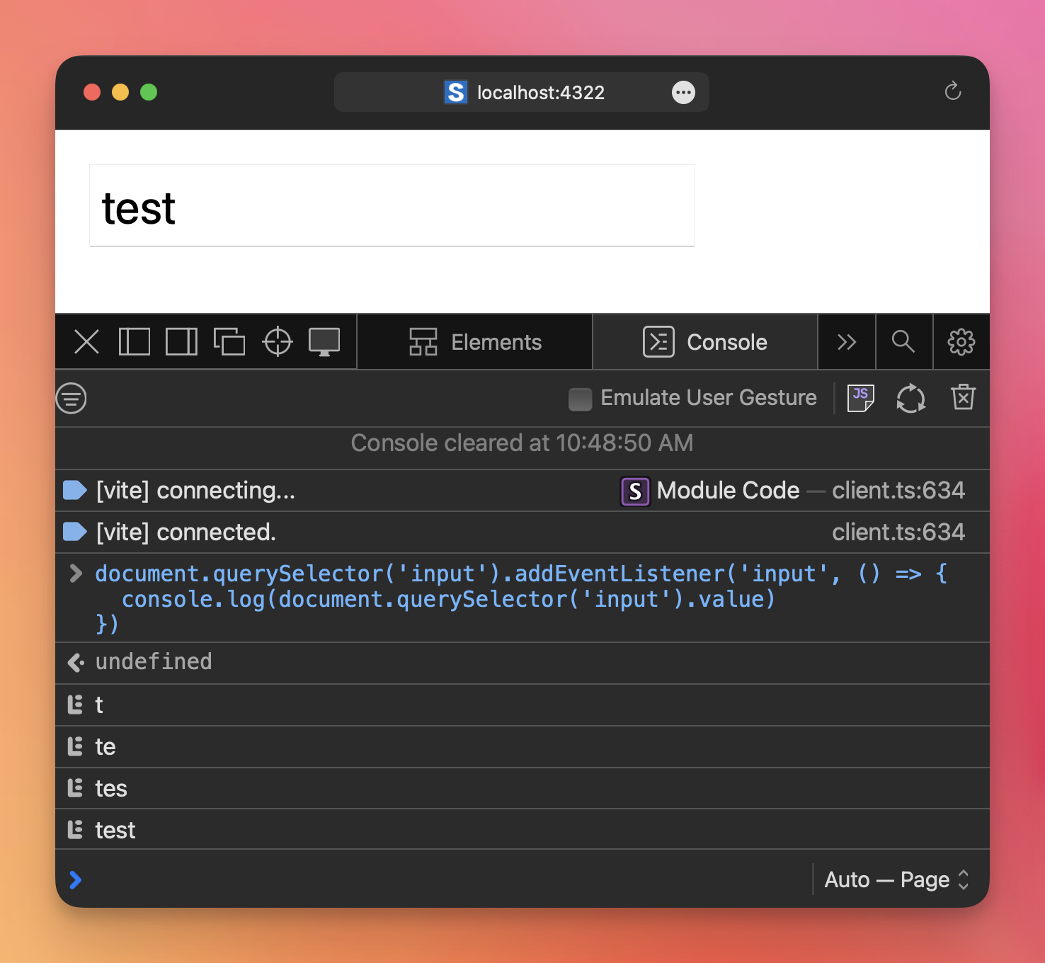 For example we can add an event on the input field to listen for the input event, and print the content of the input field every time it updates: