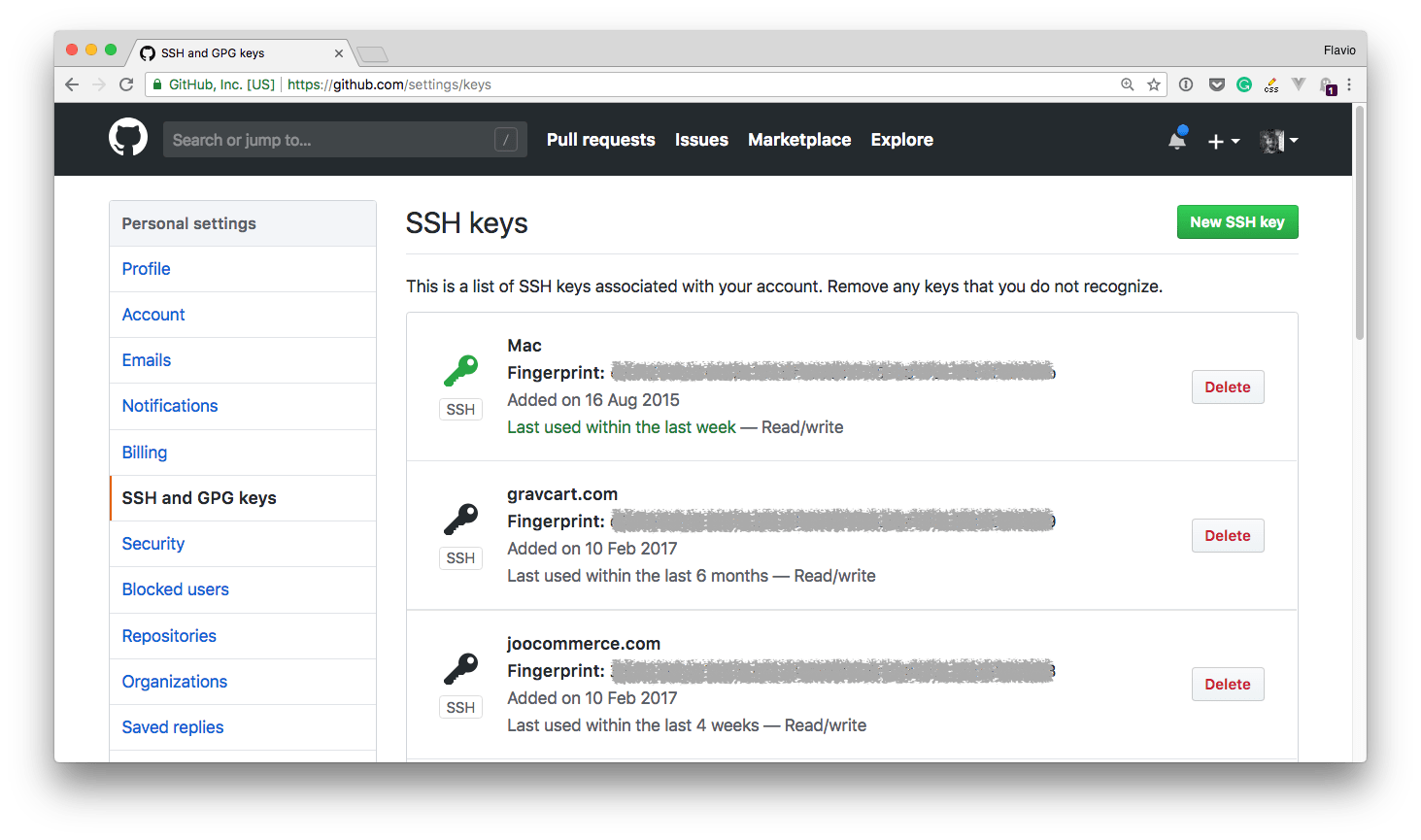 In the GitHub settings you’ll find the “SSH and GPG keys” menu: