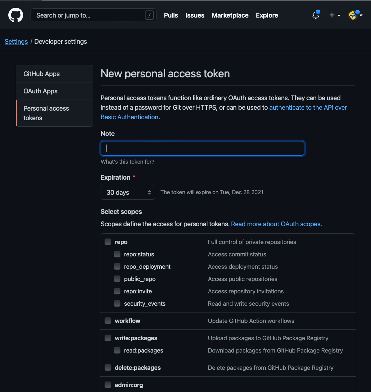 Now add a name so you’ll remember what this token is for, set the expiration to “No expiration” and enable the repo scope. That’s the only one you need: