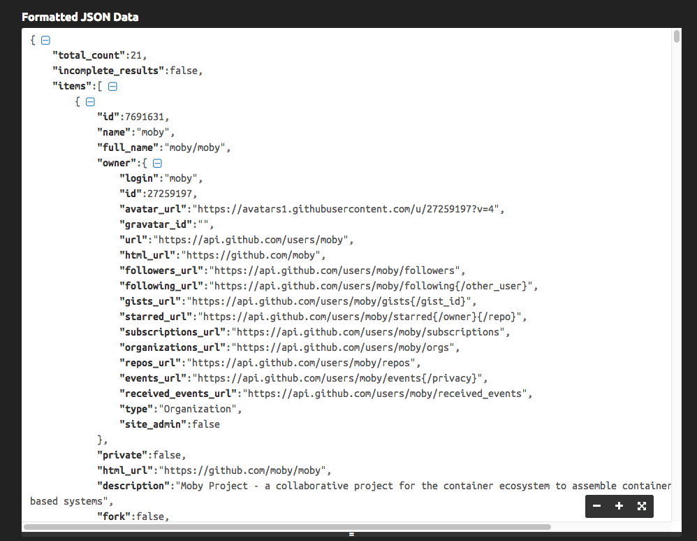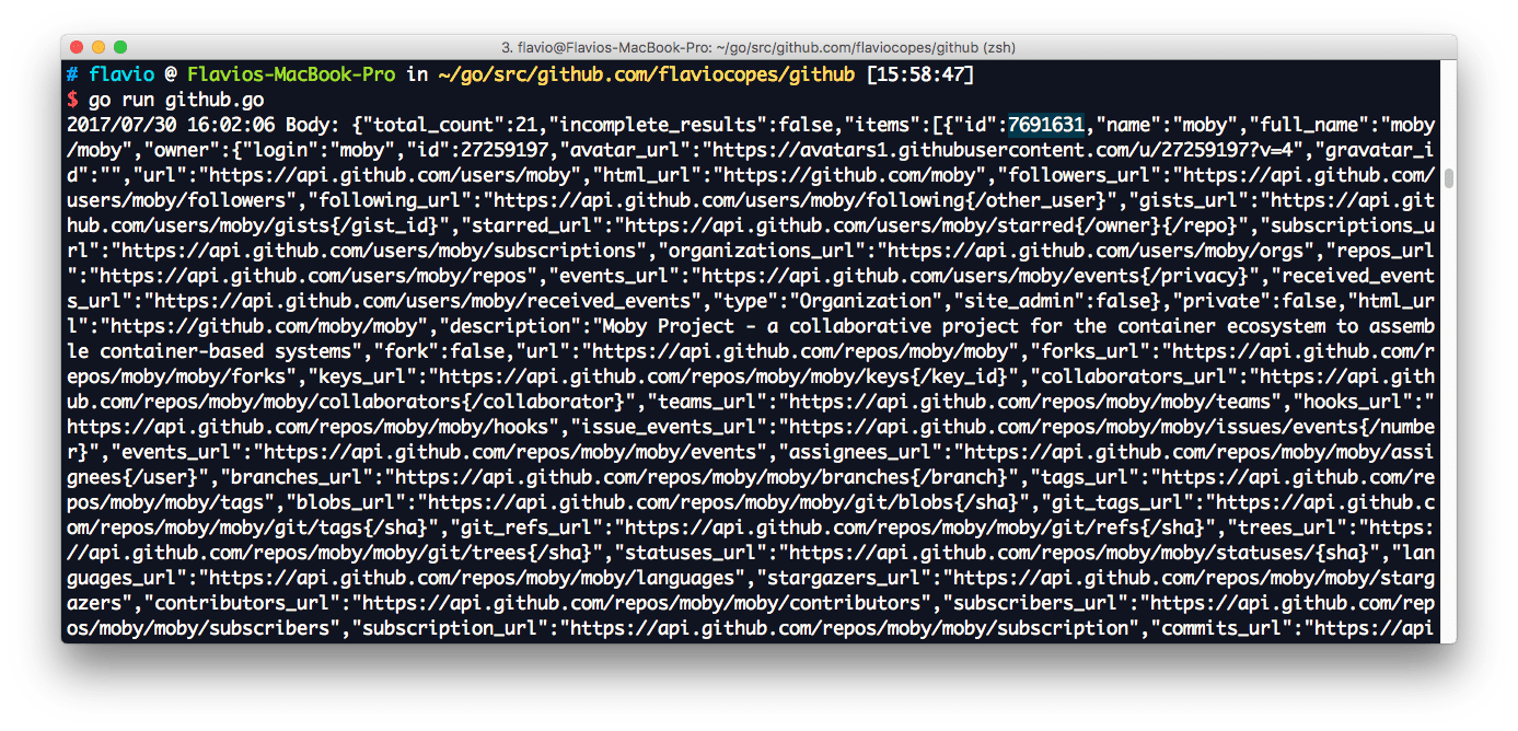 The above code creates 3 structs to unmarshal the JSON provided by GitHub. JSONData is the main container, Items is a slice of Item, the repository struct, and inside item, Owner contains the repository owner data.