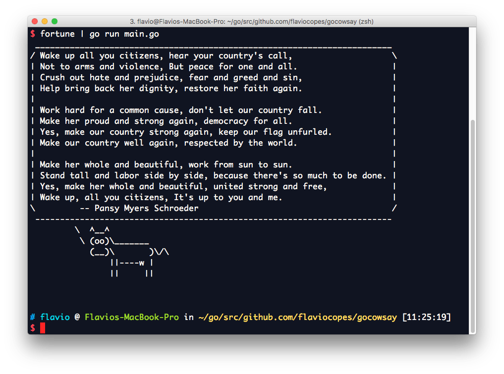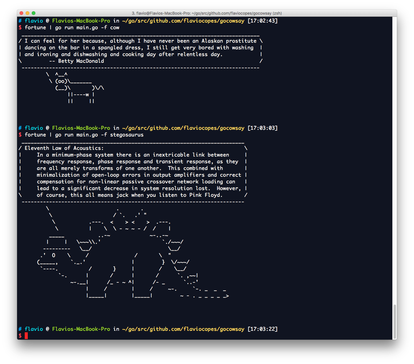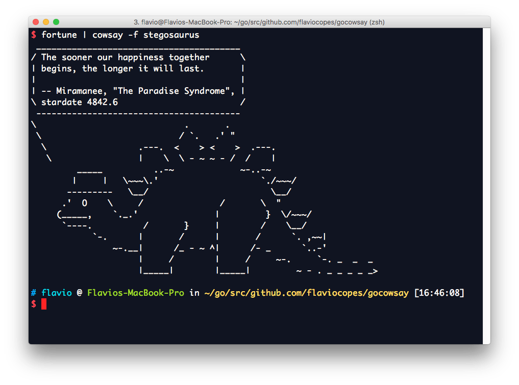 It basically generates ASCII pictures of a cow with any message you pass it to, in the above screenshot using fortune to generate it. But it’s not limited to the cow domain, it can print penguins, mooses and many other animals.