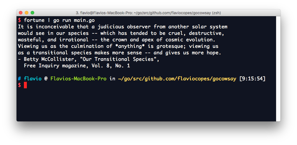 We’re missing the cow, and also we need to wrap the message into a balloon, nicely formatted.