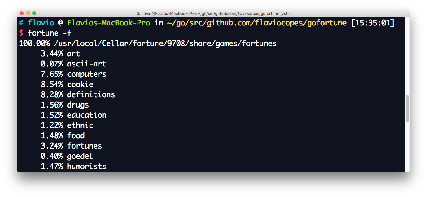 The fortunes folder location depends on the system and distribution, being a build flag. I could hardcode it or use an environment variable but as an exercise, I’ll do a dirty thing and ask fortune directly, by executing it with the -f flag, which outputs: