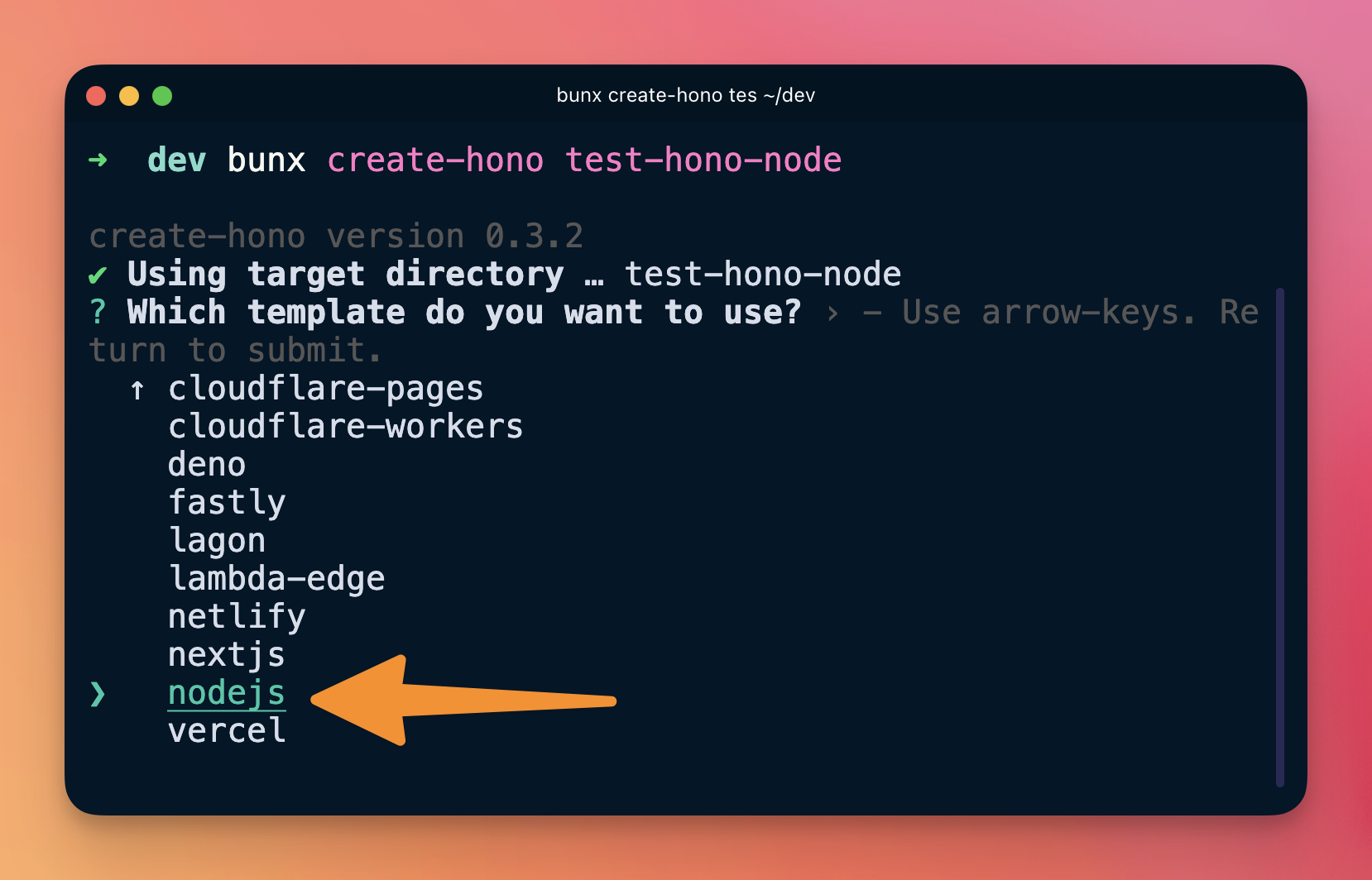 When running bunx create-hono <app-name>, select the Node.js template: