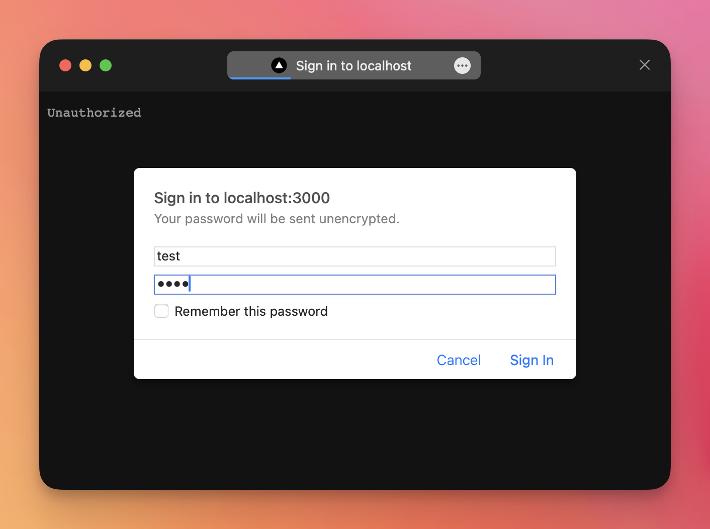 The route is accessible only with the correct credentials; otherwise the client gets 401 Unauthorized.